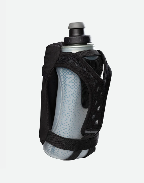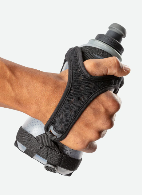Hydration handheld with more functionality. The QuickSqueeze View 18oz Insulated Handheld has a clear film pocket, allowing for easy access to see your phone while on the run. Grip-free fully adjustable hand strap and small zipper stash for valuables.