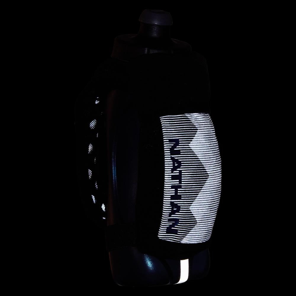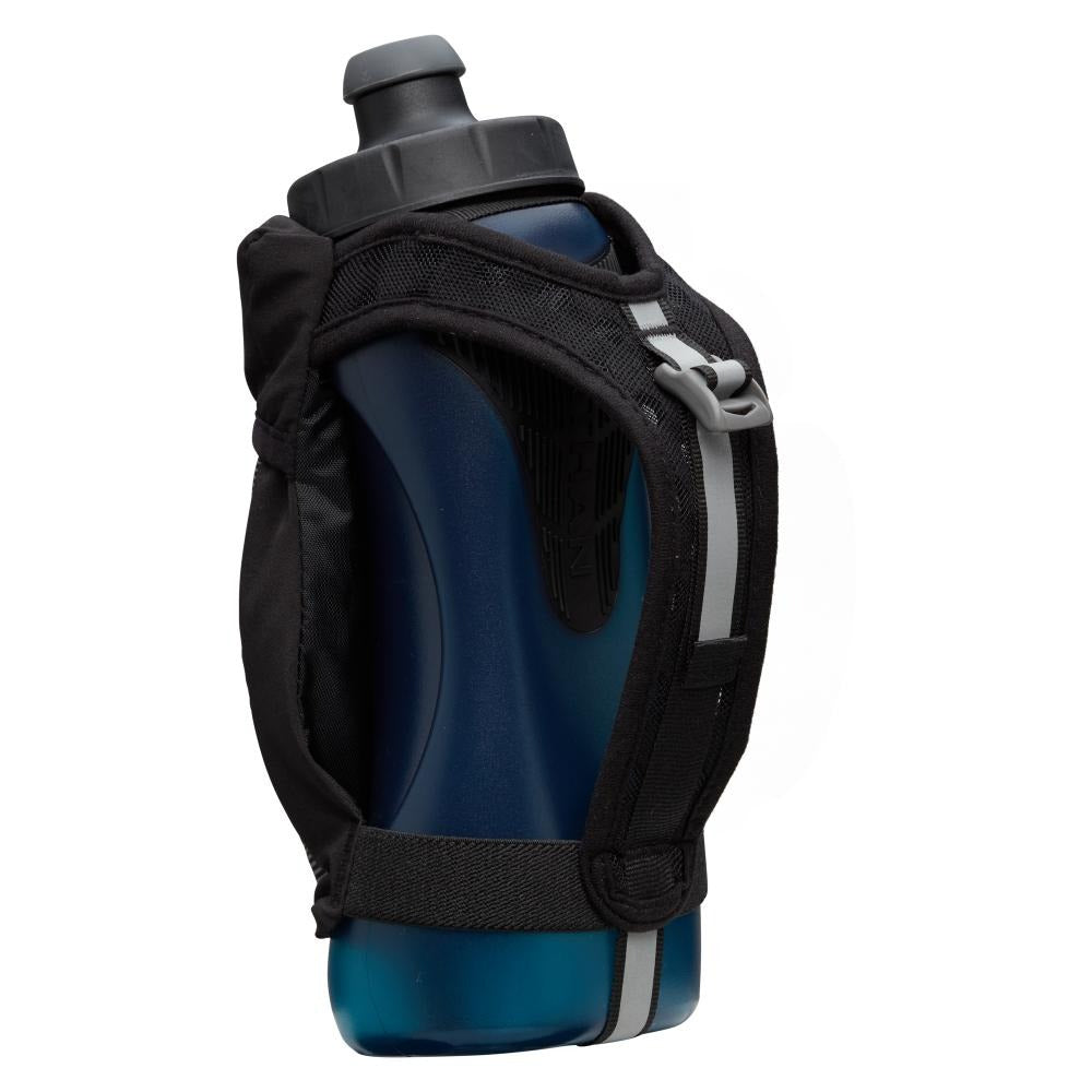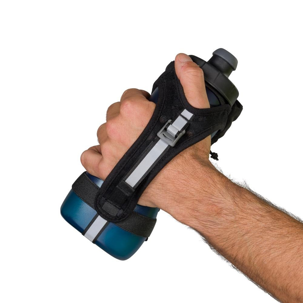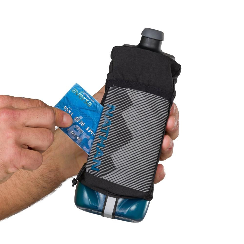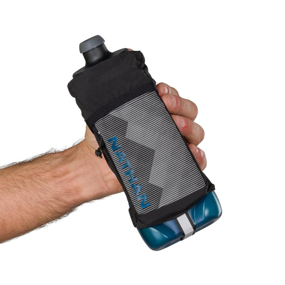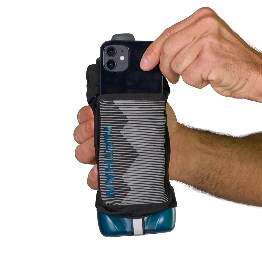 The QuickSqueeze Plus handheld bottles are 22oz and allow the wearer to hydrate with ease, and comfort and offer storage for phone and valuables. HYDRATE FASTER & EASIER A flask with a contoured bottle and push-pull blast valve nozzle allows you to hydrate faster. MAXIMUM COMFORT The updated design includes a more secure hand strap system, that utilizes Nathan's grip-free technology, and a softer bottle making it easier to squeeze and control the flow of water. Plus a TPU grip keeps the bottle in place despite hand sweat. EXTRA STORAGE TO GO Phone pocket construction to fit most smart phones. Small zipper stash pocket for valuables.