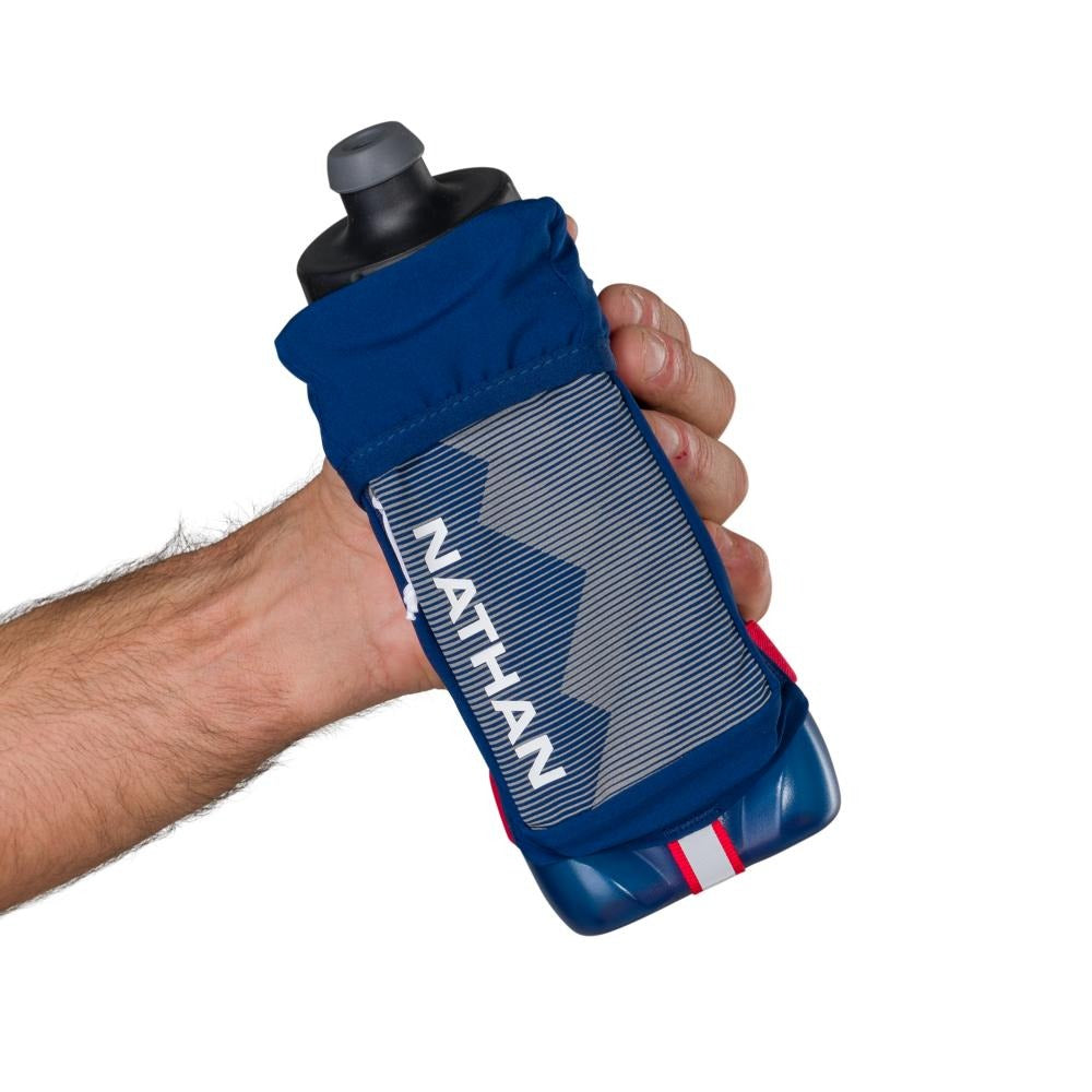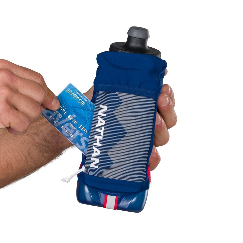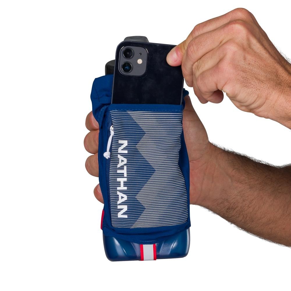 The QuickSqueeze Plus handheld bottles are 22oz and allow the wearer to hydrate with ease, and comfort and offer storage for phone and valuables. HYDRATE FASTER & EASIER A flask with a contoured bottle and push-pull blast valve nozzle allows you to hydrate faster. MAXIMUM COMFORT The updated design includes a more secure hand strap system, that utilizes Nathan's grip-free technology, and a softer bottle making it easier to squeeze and control the flow of water. Plus a TPU grip keeps the bottle in place despite hand sweat. EXTRA STORAGE TO GO Phone pocket construction to fit most smart phones. Small zipper stash pocket for valuables.