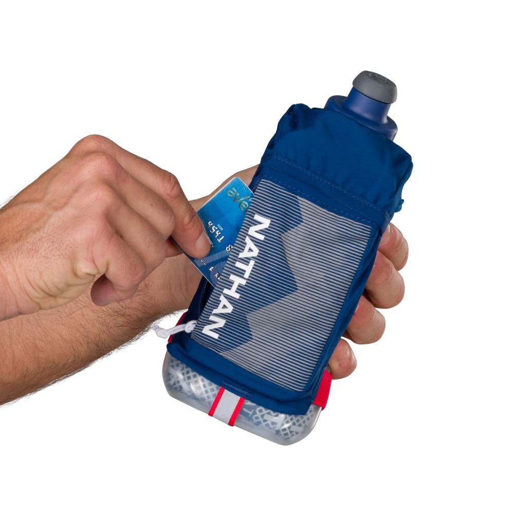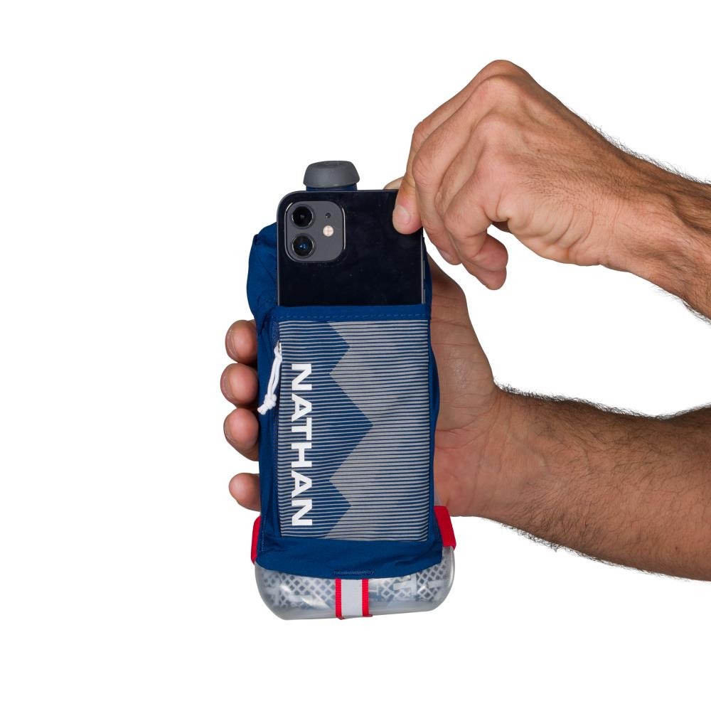 Stay hydrated and keep your fluids cooler, longer with the QuickSqueeze Plus Insulated Handheld Bottle. The updated design includes a more secure hand strap system, that utilizes Nathan's grip-free technology, and a softer bottle making it easier to squeeze and control the flow of water. The plus is there are two pockets; one designed to fit most smartphones, and a zippered pocket for valuables.