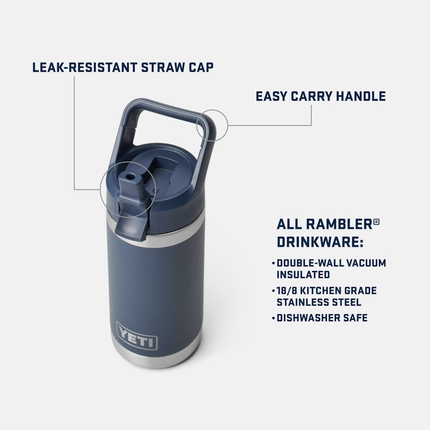 The YETI Rambler Jr. is a small-and-mighty kids' bottle over-engineered for your little wild ones. This 12-ounce powerhouse inherited double-wall vacuum insulation from its Rambler Drinkware predecessors, carrying on the family legacy by locking in ice-cold water for backyard campouts and breaks between tag. We made sure its included straw cap is leak-resistant when closed and both the bottle and cap are dishwasher safe. Plus, it's engineered with a super strong, stainless-steel armor that can handle taking a tumble.