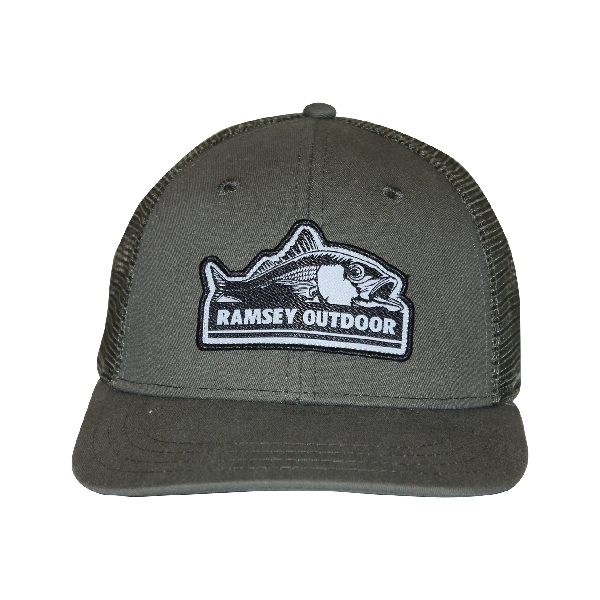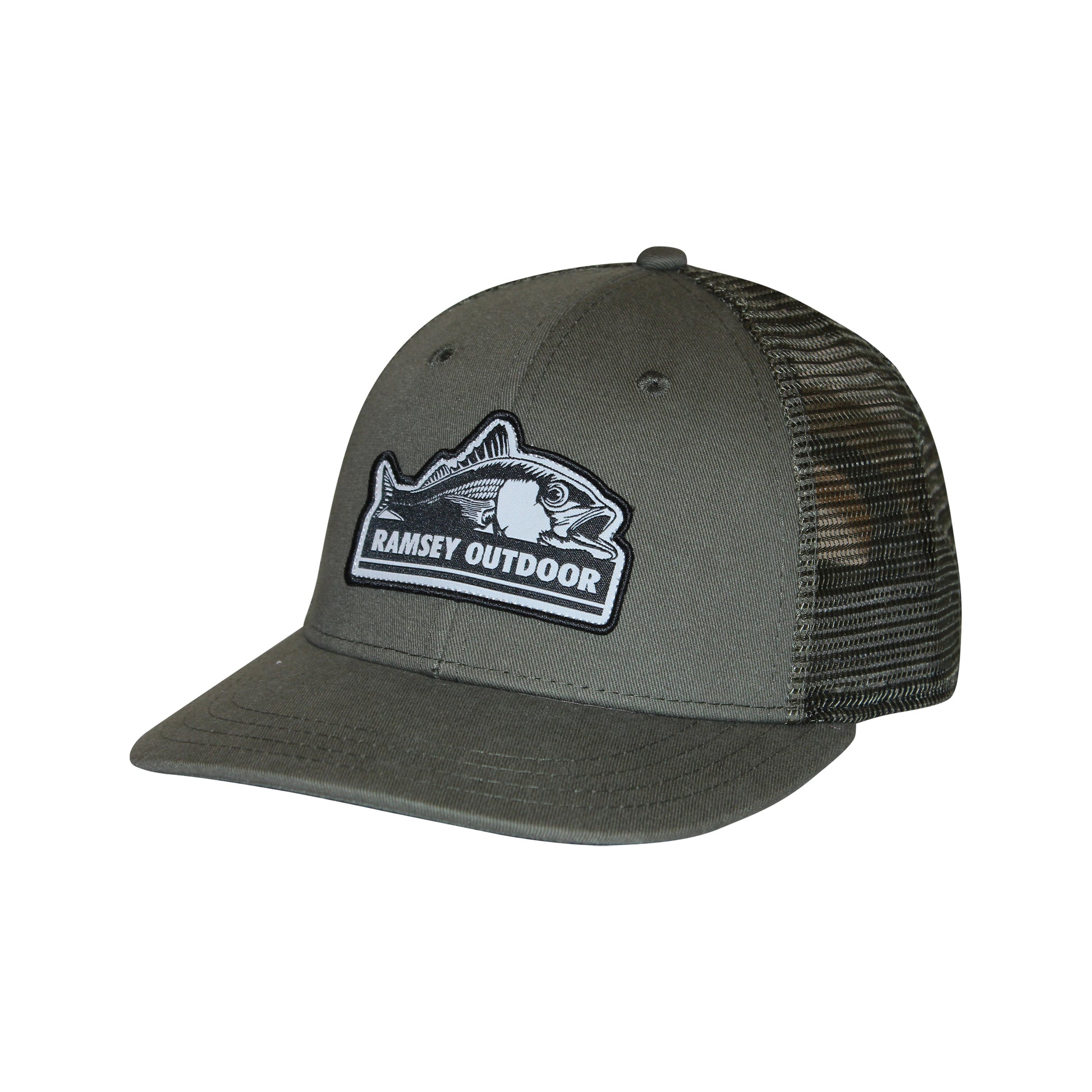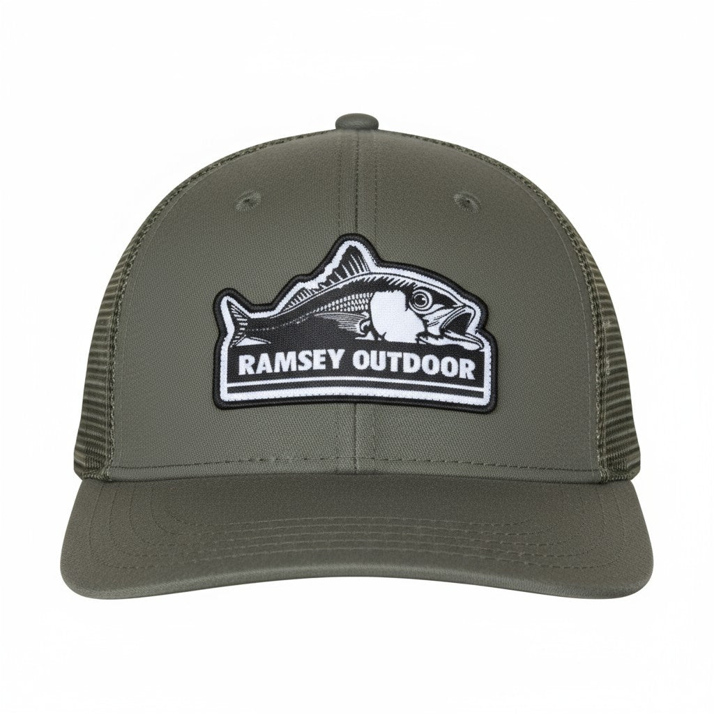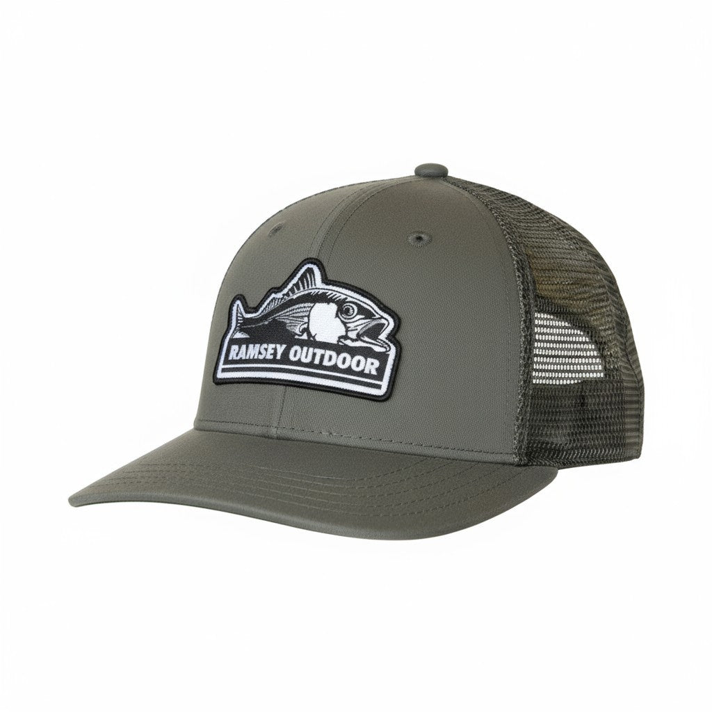 The Ramsey Outdoor Fish Logo Trucker Hat is a low profile trucker hat with a mesh back. It features the Ramsey Outdoor original fish logo, a snap-back closure for a tailored fit, and a structured slight-curved visor. This 6-panel hat has a low crown and a cotton twill sweatband.