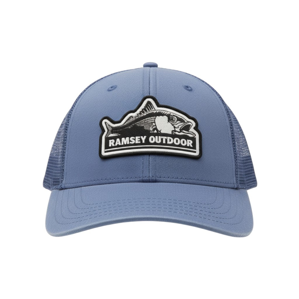 The Ramsey Outdoor Fish Logo Trucker Hat is a low profile trucker hat with a mesh back. It features the Ramsey Outdoor original fish logo, a snap-back closure for a tailored fit, and a structured slight-curved visor. This 6-panel hat has a low crown and a cotton twill sweatband.