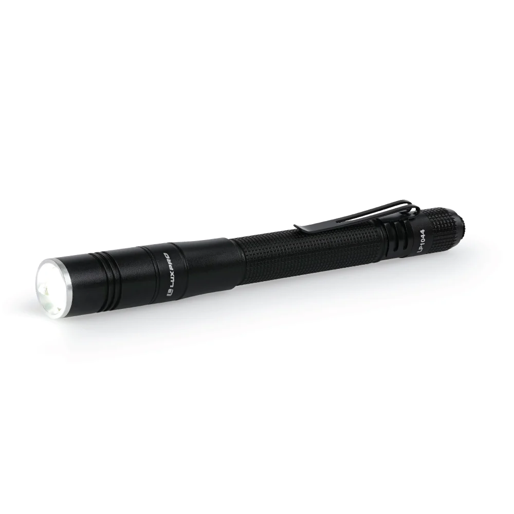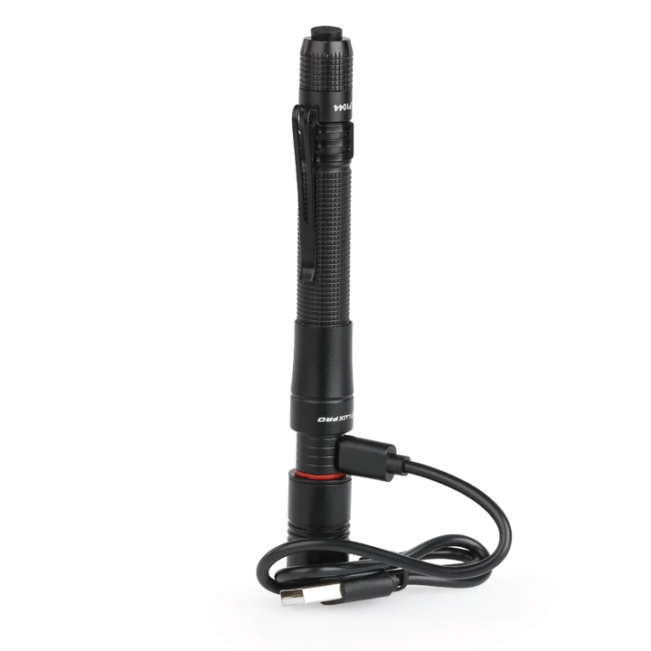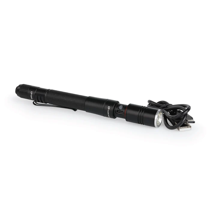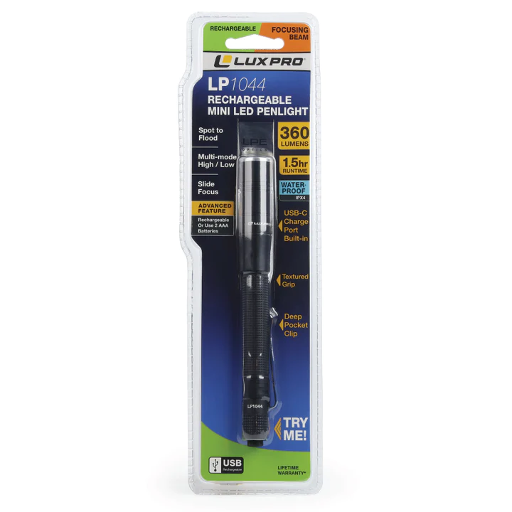 The LUXPRO rechargeable focusing LED penlight flashlight is extremely lightweight and compact. This flashlight is made durable with aircraft-grade aluminum and comes equipped with a quality pocket clip so you can attach it to your tool bag or pocket. The flashlight features a tactical on/off button to select between high and low mode. The output range on high is 360 lumens and on low is 50 lumens. It has a runtime of 1.5 hours on high and 7 hours on low. This light comes with a rechargeable 10850 3.7V 750mAh lithium-ion battery that charges in approximately 3 hours, and it can alternatively run on 2 AAA batteries. Included is a USB-C cable for convenient charging. The charging indicator light next to the charging port will turn red to indicate that the light is charging, and blue when it is fully charged. For additional peace of mind, this rechargeable tactical light comes with a Limited Warranty against Manufacturer's Defects.