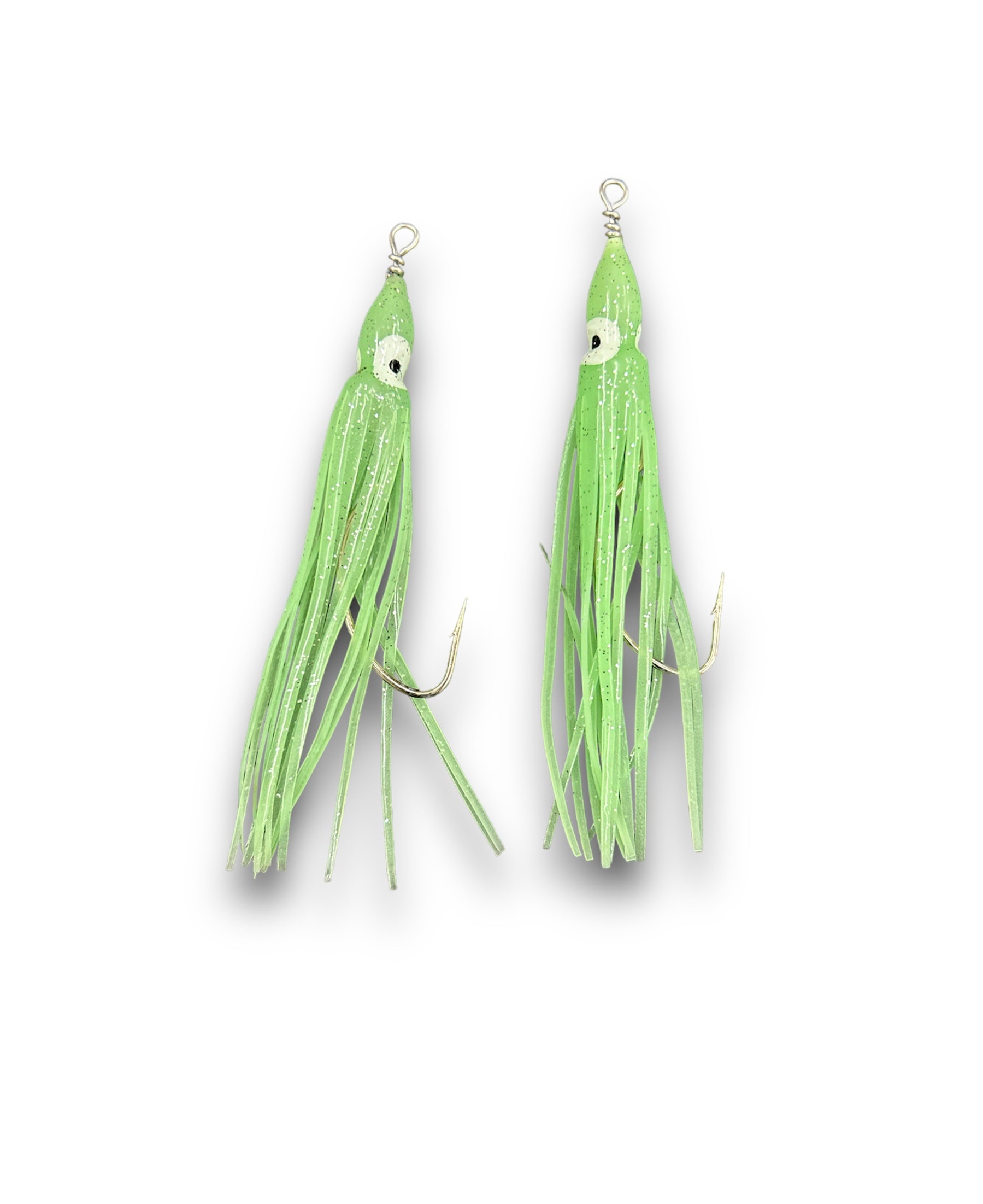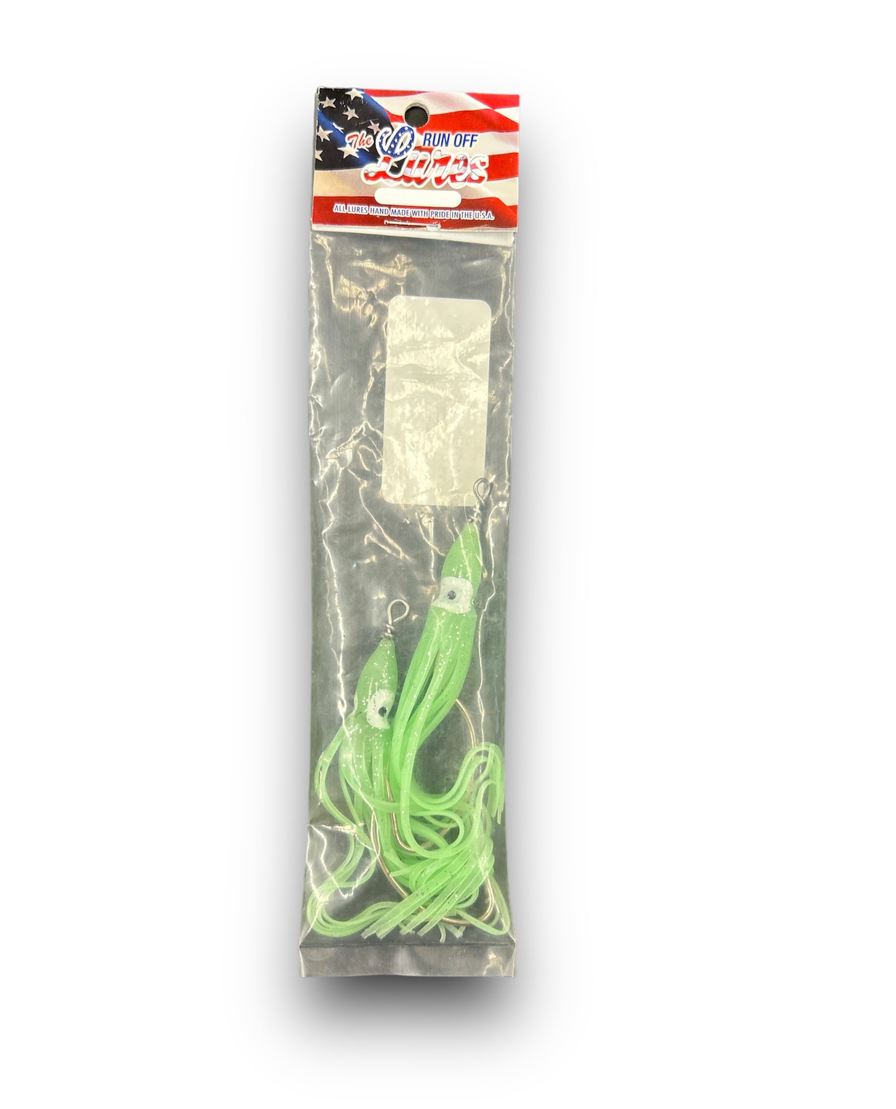 Run Off Lures 4-1/2'''' Squid are available rigged (2 pack) and unrigged (5 pack). Rigged Squid are rigged with hooks and stainless steel wire. All colors glow.