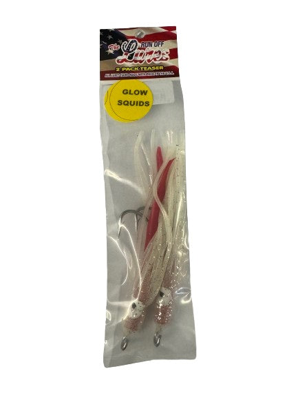 The Run Off Lures Rigged Teaser Glow Squid in size 9/0 contains two squids rigged with 9/0 hooks and stainless steel wire.