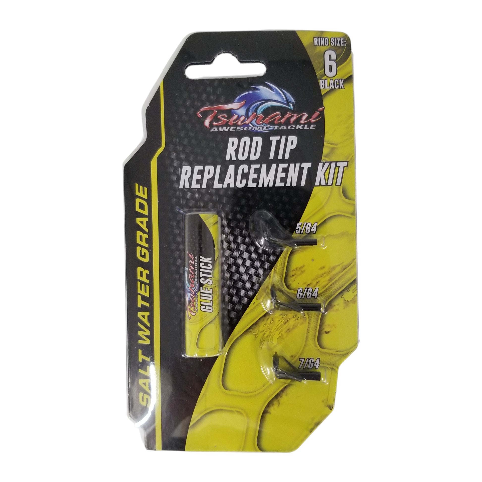 The Tsunami Ring Size 6 Rod Tip Replacement Kit has everything you need to replace the tips on your Tsunami fishing rods. This kit includes a 5/64 tip, 6/64 tip, 7/64 tip, and a glue stick.