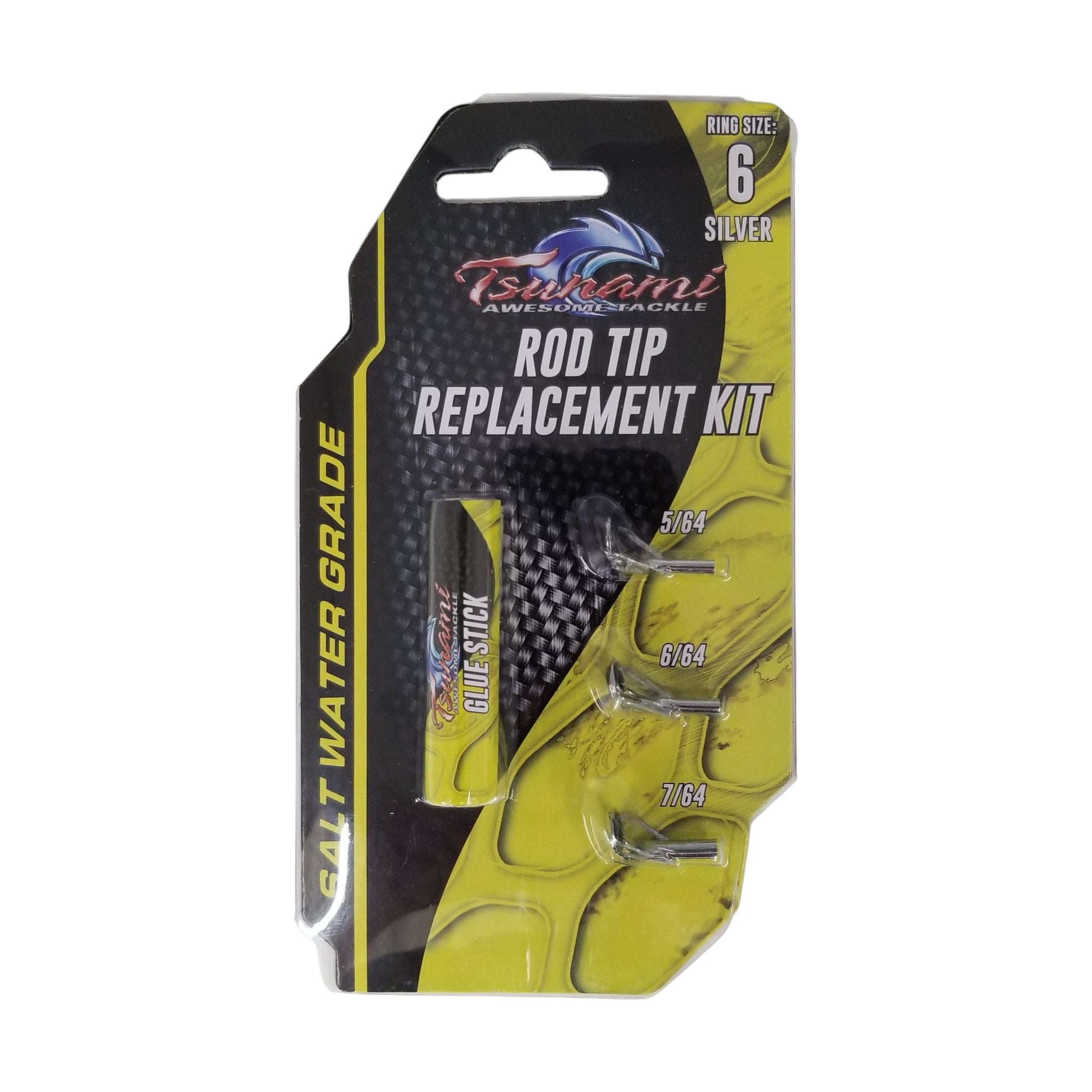 The Tsunami Ring Size 6 Rod Tip Replacement Kit has everything you need to replace the tips on your Tsunami fishing rods. This kit includes a 5/64 tip, 6/64 tip, 7/64 tip, and a glue stick.