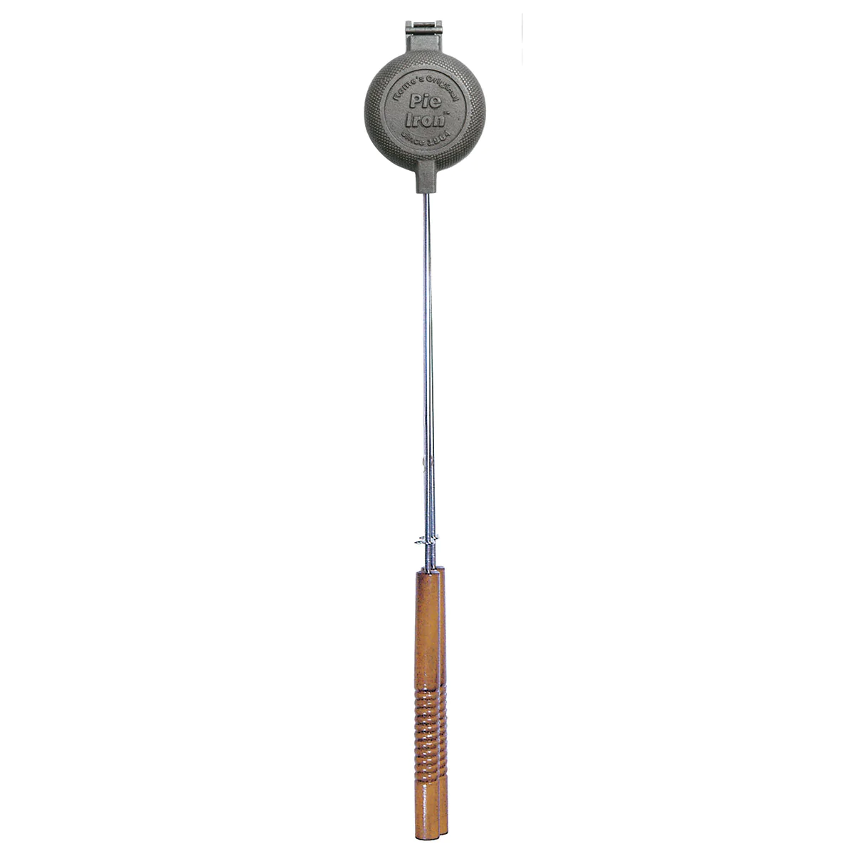 The Original Round Pie Iron by Rome is perfect for cooking desserts & savory pies over a campfire or fire pit. The round design is designed to crimp down on the edge of the bread crust to form a round pie that seals in the goodness. Constructed from solid cast iron with dependable steel rods & wood handles. To use simply place a piece of buttered bread in the clam shell style compartment, fill with preserves, pie filling, cheese or meat. Add the second slice of bread. Close the lid and toast over the fire until done. Perfect for campfires or backyard firepits.
