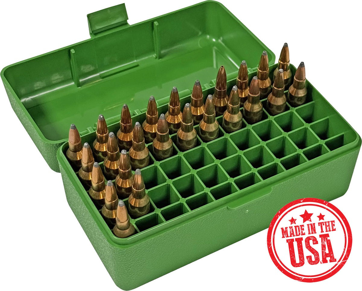 MTM CASE-GARD 50 round rifle ammunition cases are still the first choice of rifle enthusiasts throughout the world since 1968. Made of virtually indestructible polypropylene, that will not warp, crack, chip, peel, expand or contract.