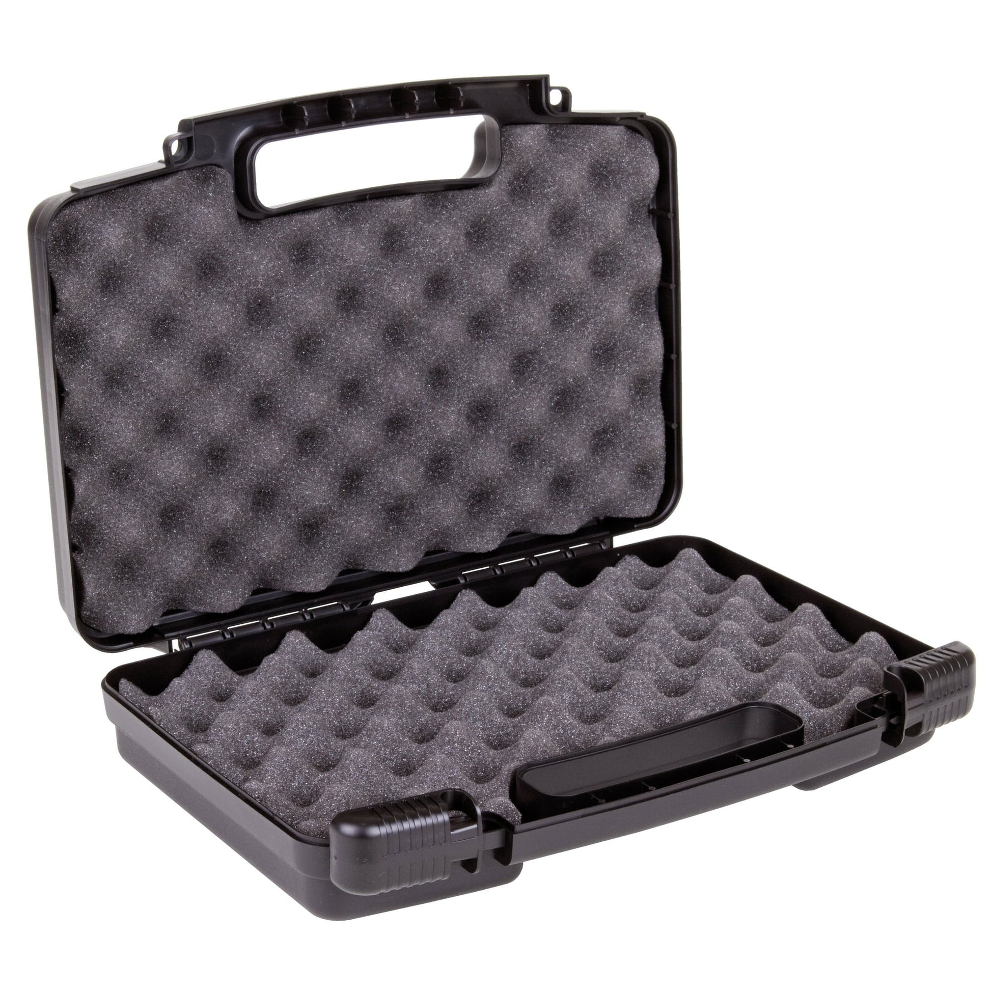 Keep your sidearm safe and secure with this rugged and durable Flambeau Outdoors 14" Pistol Case. It features a locking clam-shell design that can be secured with a padlock. It also boasts a foam-lined interior to protect your gun's finish while shielding it from light impact. The wide, high-profile design makes it ideal for transporting hunting and duty-sized pistols as well as compact sidearms and smaller personal defense weapons. This locking pistol case sports a wide ergonomic handle in the center of the unit for easy carrying. It is stackable and fits in most gun safes with ease.