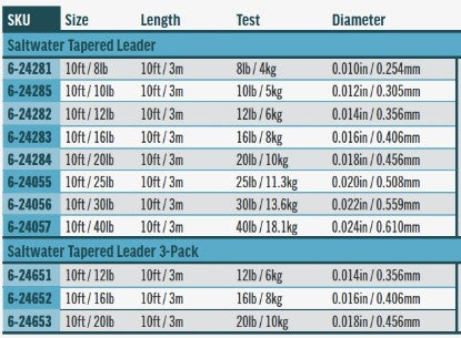 RIO's Saltwater leaders an excellent general purpose saltwater leader for a multitude of species. The leaders are made of a medium stiff nylon and have a taper design that easily turns over typical saltwater patterns and copes with tough winds. The leader is made of a material that is easy to knot and has great knot strength. Each leader is 10ft long and available from 8lb (0.010") to 40lb (0.024"). A tough, abrasion resistant, general purpose, knotless tapered saltwater leader.