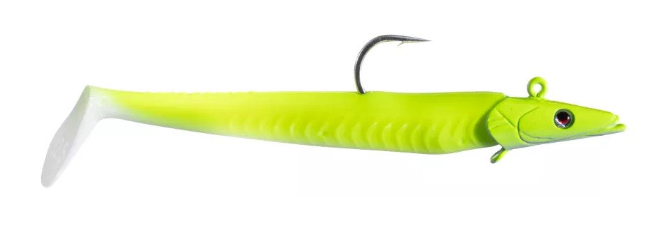 Go vertical for big cod, pollock, sea bass, even halibut with the Savage Gear® Sand Eel. Representing every saltwater predator's favorite prey, this jighead and tail fit together seamlessly for outstanding realism. But it's the lively, incredibly lifelike swimming action of the tail that will trigger the hardest, most brutal attacks. (Sleeper technique: try slow-trolling the Sand Eel over smooth bottom as a search bait.) Extremely effective at hooking and landing heavy fish, the Sand Eel is molded onto a saltwater-grade, custom Japanese forged carbon steel hook. 1 jighead and 2 tails per pack.