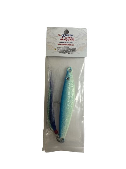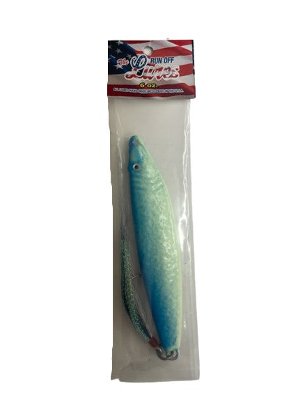 Run Off Custom Sardines are made of solid metal baked powder coated finish so they will not rust. Jig them or troll them; they come in ounce measured sizes.