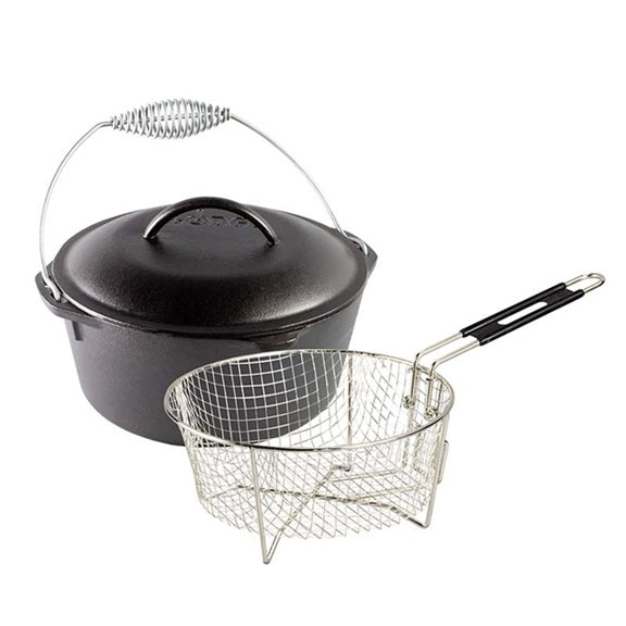 This duo features a 5 quart dutch oven and a commercial-grade fry basket. Cast iron provides great heat retention, incredible durability, and a naturally seasoned cooking surface that’s ready to go, straight from the foundry. Set up a fry kitchen for fish, chicken, onion rings, and french fries. Stay crispy, friends!