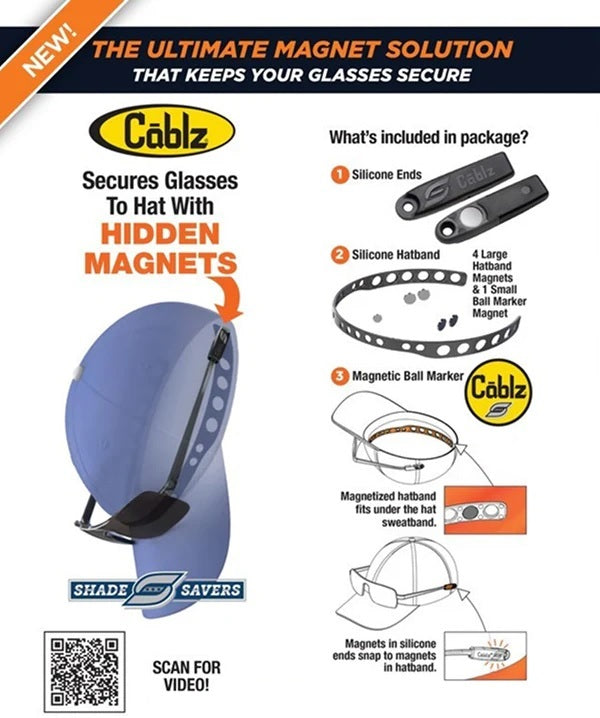 Designed with golfers and fishermen in mind, the Cablz Shade Savers are the solution to protecting your eyewear. Crafted with hidden magnets and a customizable silicone headband, this patented innovation locks your shades to your hat with a secure, lightweight grip.