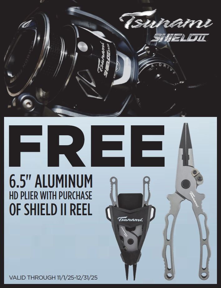 The Tsunami TSSHDII4000 Shield II 4000 Spinning Reel is engineered for peak performance and ultimate durability. This high-performance spinning reel delivers power and precision in any saltwater or freshwater environment. Built with an all-metal body and a watertight design utilizing 12 internal seals, it stands up to the harshest conditions and toughest fights. This size features a lightweight graphite rotor and a digitally optimized A-Drive aluminum main gear for smooth retrieval and efficient power transfer. Larger sizes (5000–8000) are outfitted with a rugged aluminum rotor and a B-Drive aluminum brass main gear—offering added strength for battling trophy fish. A sealed CF3 drag system ensures consistent, waterproof drag pressure, while 5+1 dual-sealed stainless steel bearings and a unique sealed anti-reverse bearing provide flawless operation under pressure. The braid-ready spool, machined handle arm with a non-slip round power knob, and convertible retrieve make this reel an elite choice for serious anglers.