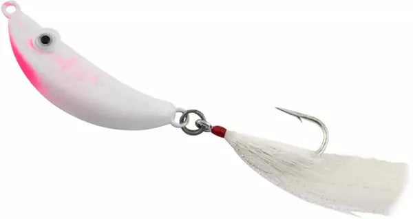 The Run Off Lures 2 oz. Shrimp Bucktail Fluke Jig is designed for saltwater fishing and is great for catching fluke. The snag-resistant head shape allows you to fish near rocks with confidence. It has a free swinging hook and a hand-tied bucktail.