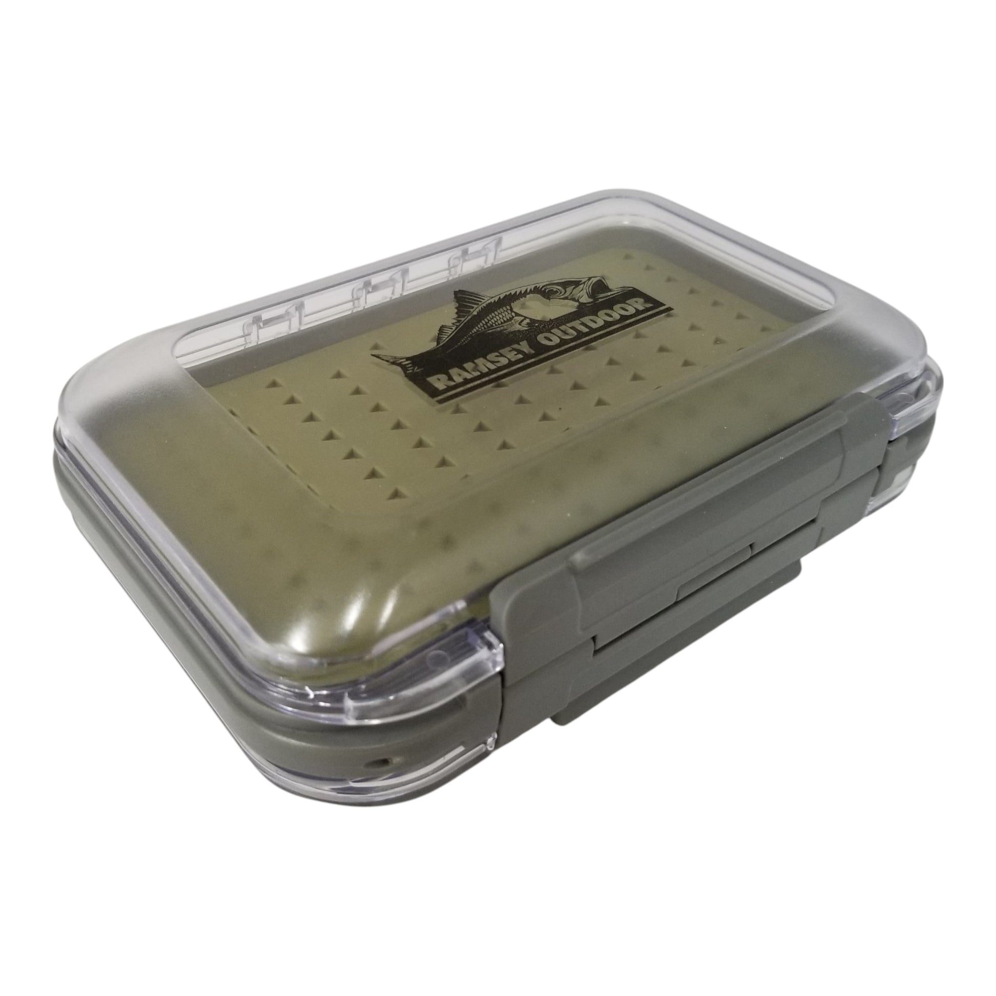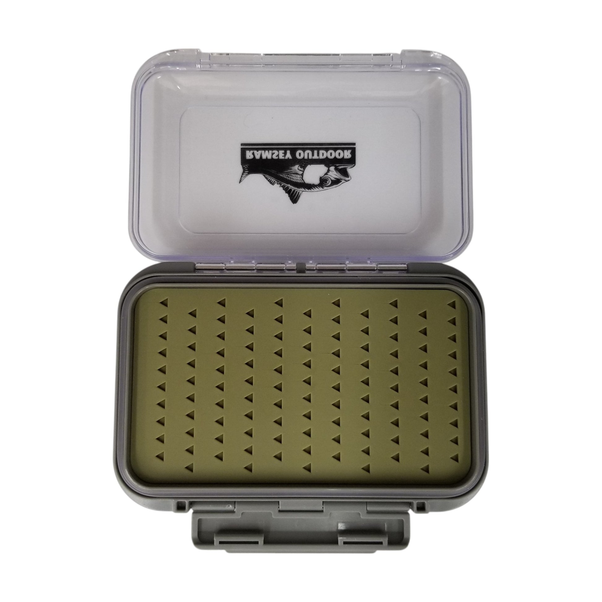 The New Phase Large Silicon Double Sided Fly Box features our silicon liner for increased durability and scent free fly storage. Clarified ABS construction with stainless steel hinge pins. This box features our Ramsey Outdoor fish logo in the middle.