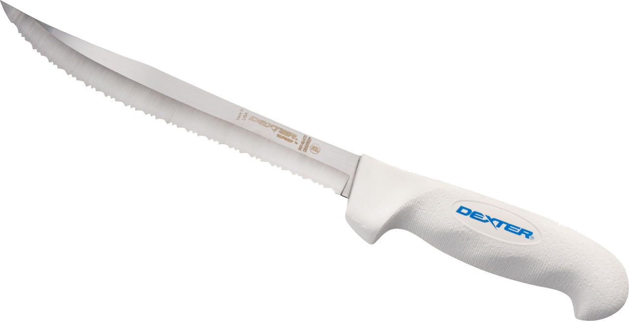 The Dexter Outdoors SG142-8TE-PCP 8" SOFGRIP Tiger Edge Scalloped Knife goes through fresh and frozen bait, scales and can fillet a fish with ease. It's a great all-around knife for bait, cutting cartilage and help processing your fish. It features our SOFGRIP™ handle that is soft to the grip and provides great control along with slip resistance. It features our proprietary high carbon, high alloy, stain free DEXSTEEL™. This knife is NSF certified and is made in the U.S.A.