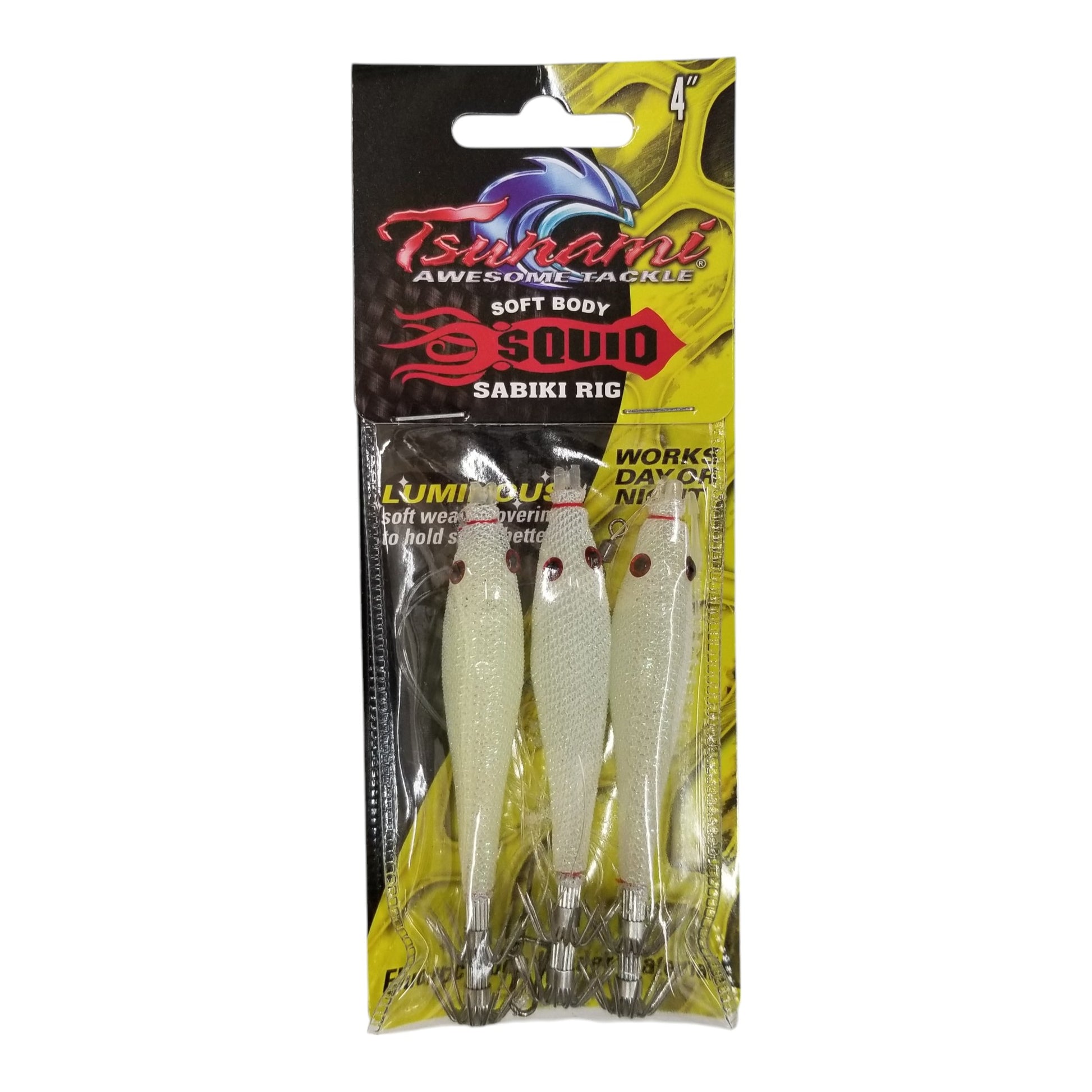 The Tsunami 4" Soft Body Squid Sabiki Rig features a buoyant body for more attractive movement and a luminous soft weave covering over the soft body to hold the squid better. It has dual row needle hooks, fluorocarbon leader material, and is pre-rigged with a premium swivel and snap for quick rigging. It is recommended to jig using vertical jerking motions and if jigging at night, shine a light on the Sabiki to activate the luminous weave for maximum attraction.