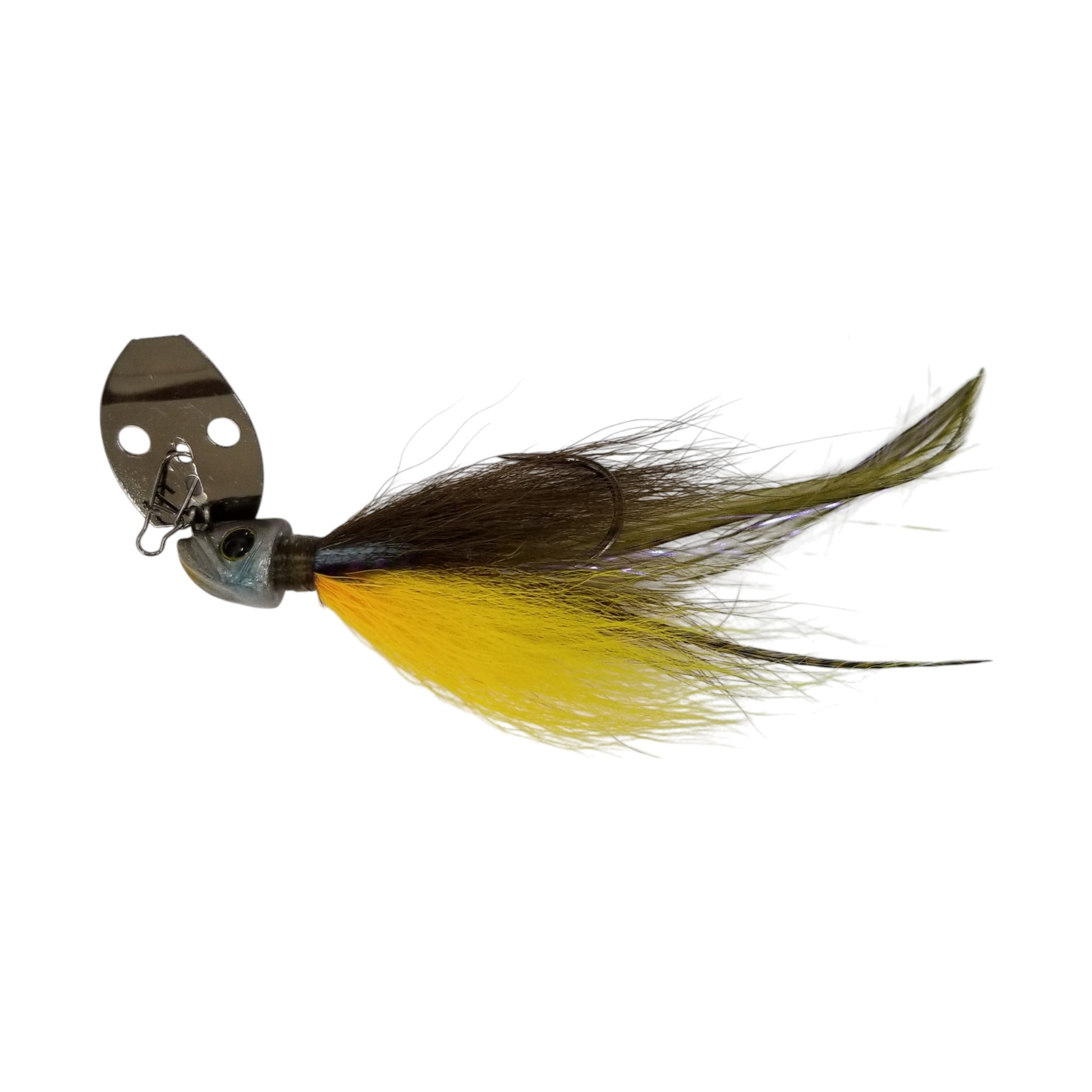 The Picasso Lures 3/8 oz. Special FX Shock Blade is a bladed jig designed to attract even the most finicky of fish. It is hand tied using 100% natural buck tail and may also have a combination of premium feathers depending on the color. The patented design helps to keep the lure down in the strike zone longer without rising, unlike other bladed swim jigs. It creates a hard thumping vibration and hunting action with a very slow retrieve. The concave belly gives an added "wobble" action that fish love and the 3X strong 5/0 Mustad Ultra Point Hook assures good penetration for a higher hook-up ratio.