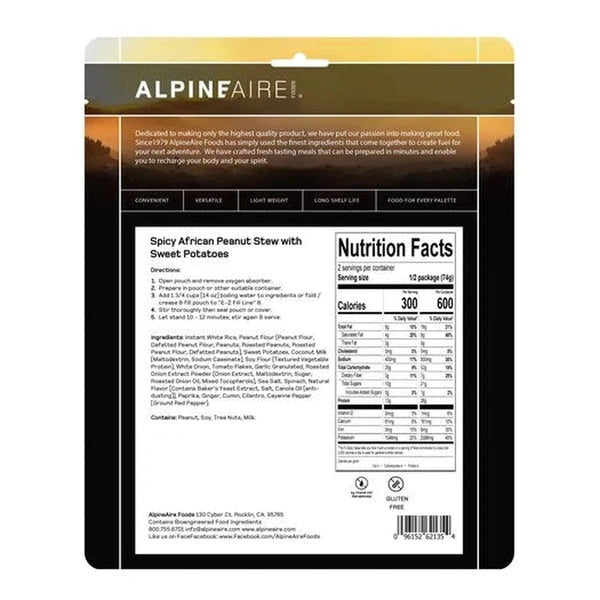 With a packed weight of only 5.78 ounces, the fully prepared AlpineAire Spicy African Peanut Stew with Sweet Potatoes meal provides a large single serving. NOTE: The meal does contain peanuts, soy, tree nuts, and milk.