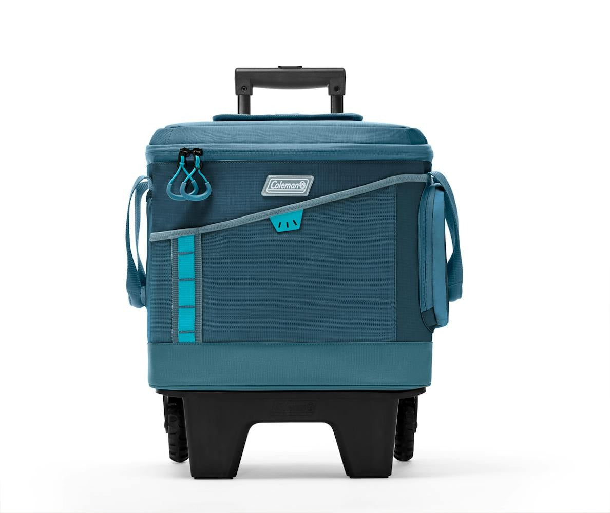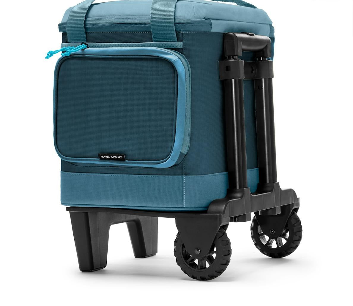 - Heavy-duty wheels, telescoping locking handle for easy pulling across rough terrain