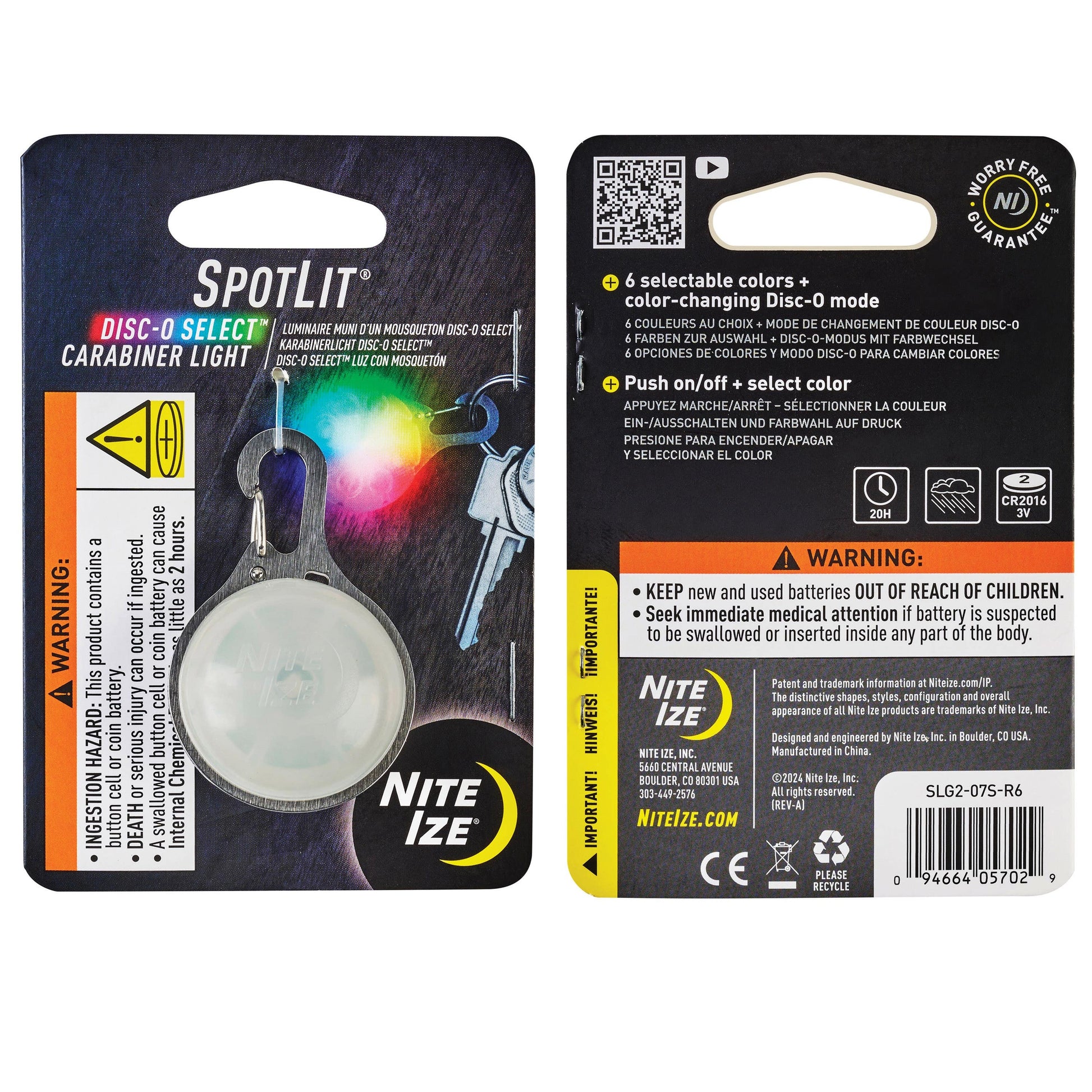 The SpotLit Carabiner Light shines when you need it most. This compact light is set in a secure stainless steel carabiner clip, allowing you to keep it clipped to your keychain, backpack or zipper pull for an on-the-go glow. Weather-resistant and durable, SpotLit comes to life with a simple push. Disc-O Select Technology enables you to choose from 6 selectable colors of red, purple, blue, aqua, green, and white, plus color-changing Disc-O mode for a smooth color blend. SpotLit runs on the 2 included CR2016 3V batteries, glowing up to 20 hours.
