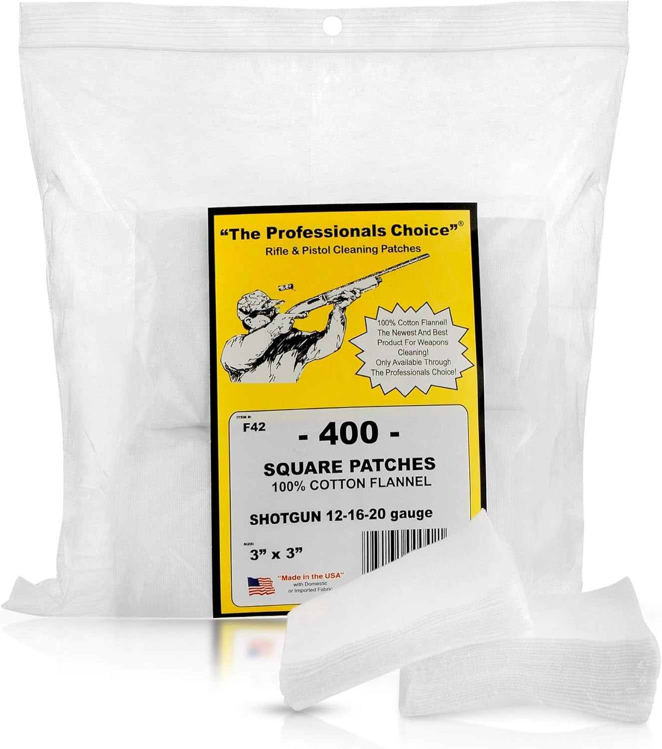 Keep your shotgun clean and performing at its best with the Professionals Choice Square Flannel Patch, made for 12, 16, and 20 gauge bores. These 3-inch by 3-inch patches are crafted from 100% cotton flannel, offering a soft, absorbent texture that won't harm your bore while delivering effective cleaning. Whether you're applying solvent, removing residue, or oiling the barrel, these patches get the job done. Packaged in a generous 400-count resealable bag, they're ideal for regular maintenance of all your shotguns.