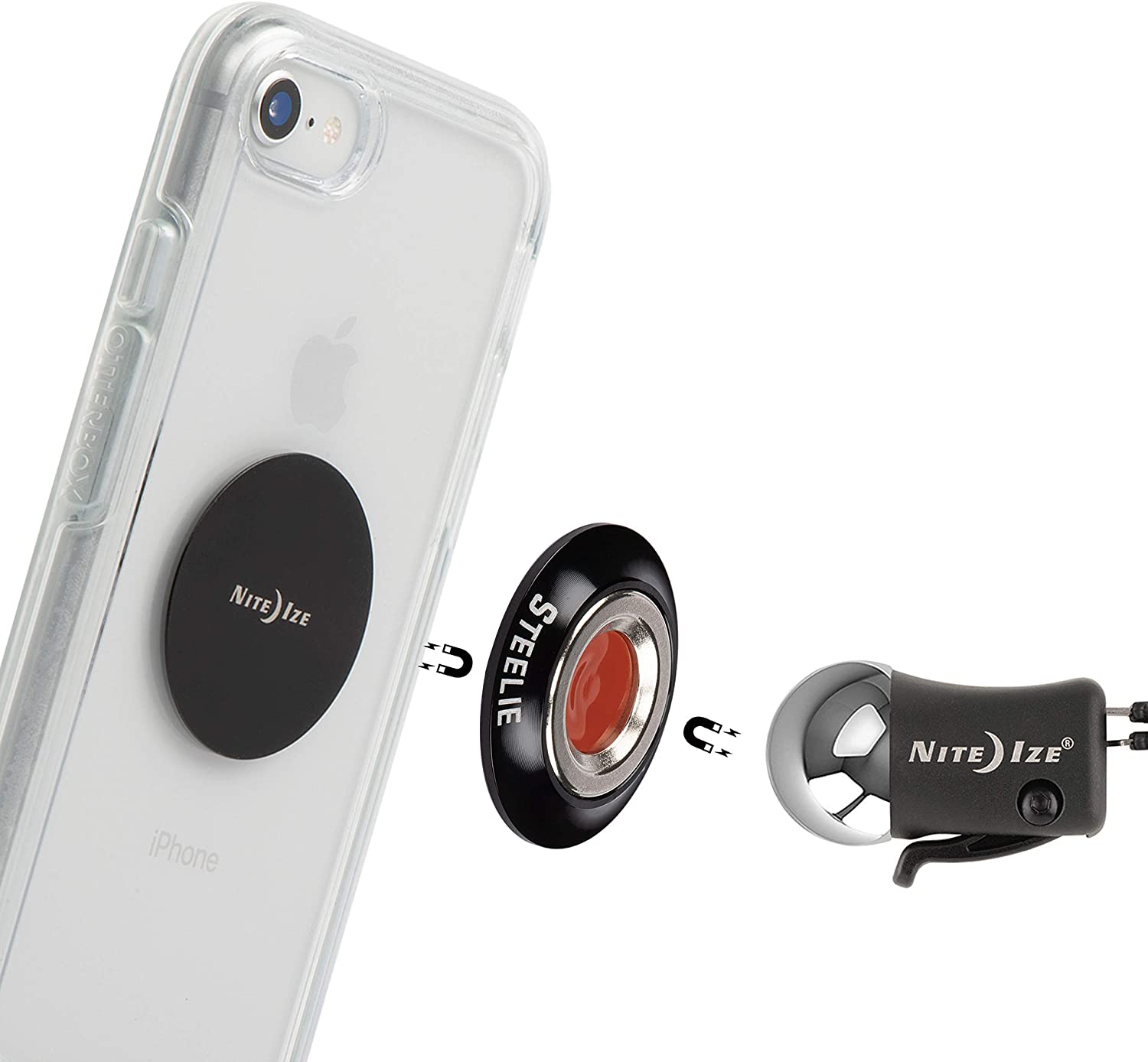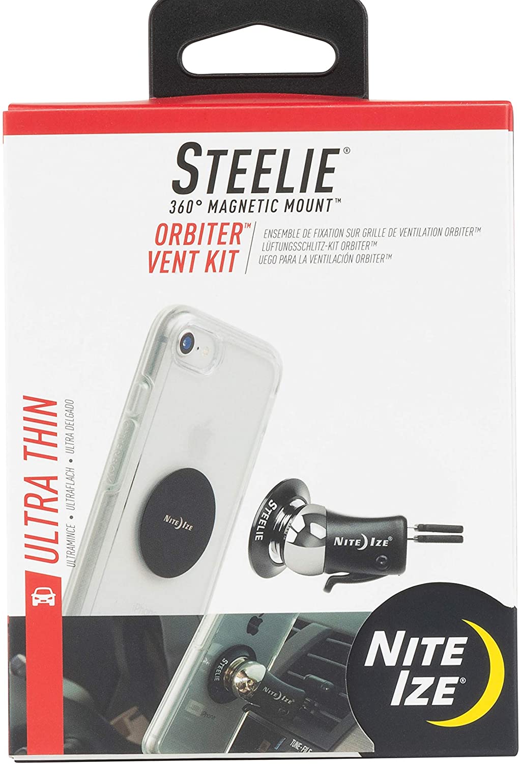 The Steelie Orbiter Vent Mount Kit takes hands-free to the next level by combining our portable Vent Mount, powerful Orbiter Magnetic Socket, and a low-profile metal plate that easily attaches to your phone or case. The Vent Mount can be moved from car to car by simply unlocking the strong cam lever, then locking it back in place on the next vehicle vent. The Orbiter Magnetic Socket attaches to the Vent Mount using a powerful neodymium magnet and silicone center for a secure connection and smooth glide. The mounting surface of the Orbiter Magnetic Socket features a thin high-friction ring that prevents slipping and ensures your phone stays securely in place. Simply adhere the low-profile metal plate to your phone or case, attach the Vent Mount to your vehicle vent, and you're ready to quickly attach, detach, and rotate your phone for the perfect viewing angle.