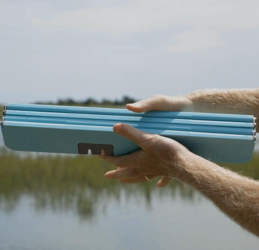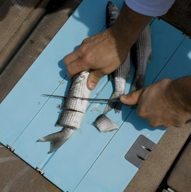 Full size 12’’x16’’ folding cutting board designed to easily fold, lock, and stow anywhere. Fits easily into kitchen drawers, boat boxes, tackle bags, and travel packs. When unfolded, it locks together to match the feel of a 1-piece design. Features non-slip rubber feet to grip any surface and a built-in knife sharpener so you’re never left with a dull blade.