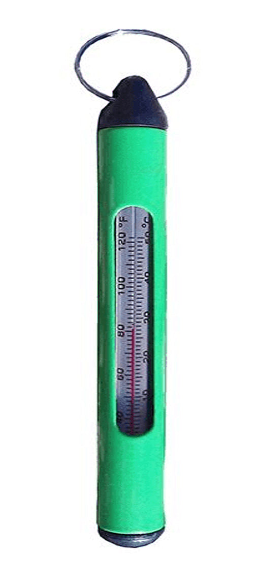 - Encased and protected stream thermometer offers durability and easy accessibility with key ring attachment that clips to a zinger.