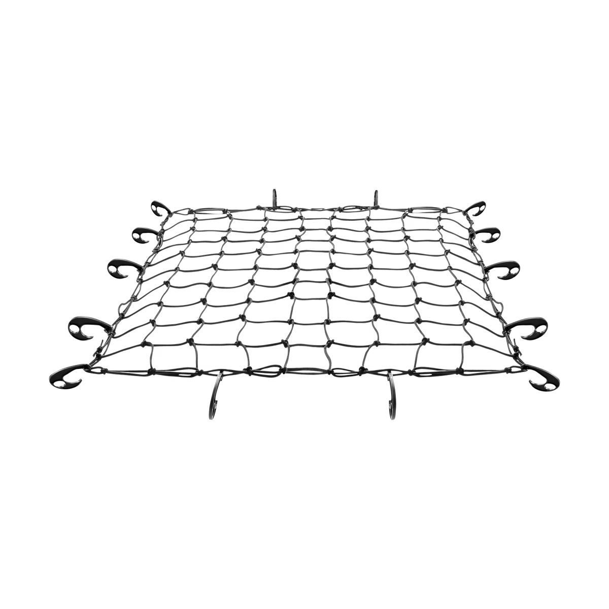 Heavy-duty cargo net secures luggage, camping gear or other cargo in rooftop baskets.