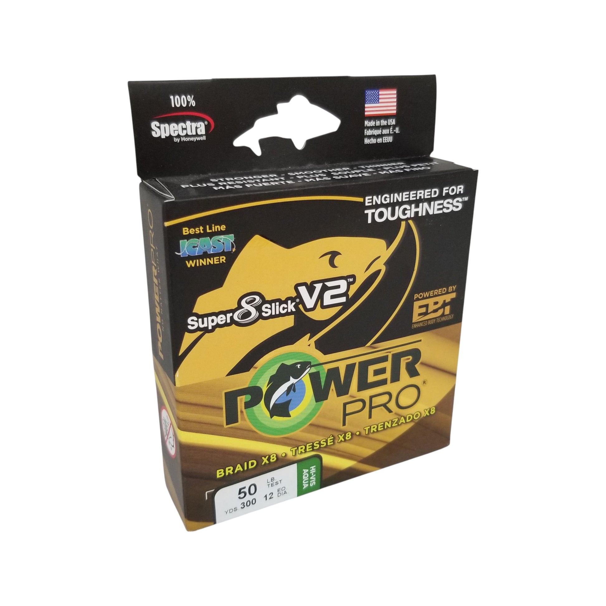 The Power Pro 50 lb. test Super 8 Slick V2 Braided Fishing Line is 300 yards of spectra fiber braided line. This line combines a new 8-end, dense weave construction with the proven Enhanced Body Technology coating process. S8SV2 delivers all of the smooth and silent benefits of original Super8Slick, plus added abrasion toughness to rip through the heaviest of cover with the same force as traditional 4-end braids.