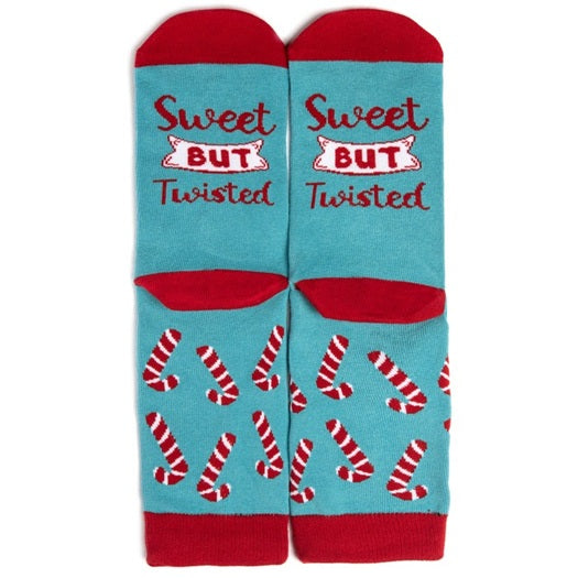 Sweeten up the holidays with a pair of these cute candy cane socks, featuring a funny secret message on the bottom: "Sweet But Twisted". It's the perfect gift idea for White Elephant parties, Secret Santa swaps, Christmas stocking stuffers and more.