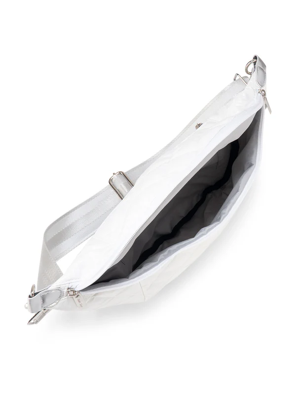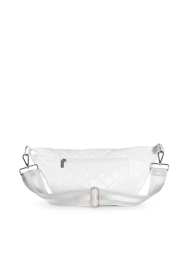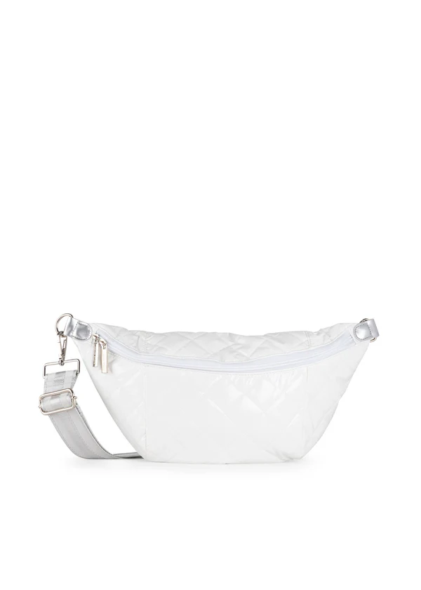 - Quilted puffer sling bag featuring top entry and additional back zip pocket.