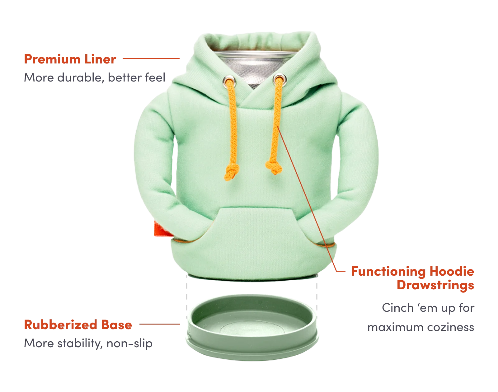 Keep your drink chill and comfy in The Hoodie, complete with all the nostalgic touches of your favorite 90s sweatshirt. We all feel a little indoorsy sometimes, even your beverage. The only thing missing from this drinkwear is the thumb holes because, well, cans and bottles don’t have thumbs.