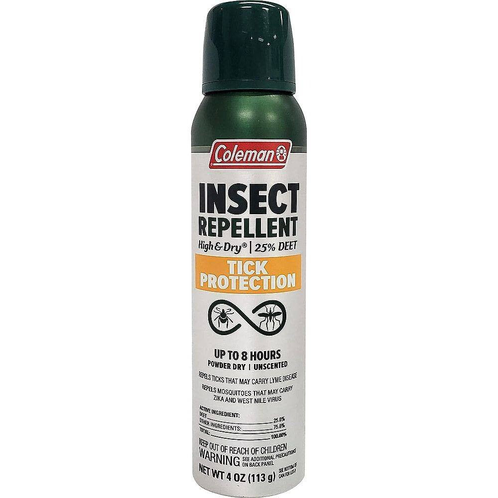 Feel comfortable while keeping insects away with Coleman Tick Protection Dry Formula 25% DEET Insect Repellent. Formulated with 25% DEET, this insect repellent spray repels ticks that may carry Lyme disease and mosquitoes that may carry West Nile virus. This unscented insect spray gets tough on bugs without an overwhelming smell. Made with a powder dry formula, this non greasy and non oily bug spray with DEET feels comfortable on your skin. This tick repellent for people offers up to 8 hours of mosquito and tick repellent protection and comes in a convenient spray can for easy use. Keep this DEET bug spray on hand for camping, hiking, hunting and other outdoor adventures. Shake well before using this tick spray for humans.