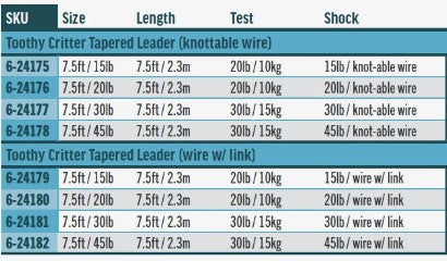 Each option is available with 15 lb, 20 lb, 30 lb and 45 lb wire strength bite tippet. The 15 lb and 20 lb wire leaders are attached to a 20 lb class tapered leader, while the 30 lb and 45 lb wire bite tippet options are attached to a 30 lb class tapered leader.