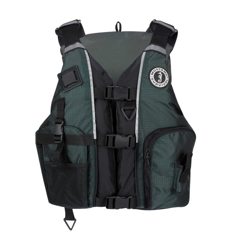 This premium front-entry PFD offers a universal size with plenty of adjustment points to customize the fit and lots of storage options and attachment points to keep your gear close at hand. Secure buckles and padded adjustable shoulders ensure the safety and comfort of all users. Expanding Cargo pocket, elastic straps, and a D-ring tether hold your tackle and tools, while the drop-down fishing bridge and rod holder make the most out of your limited space. The Topwater PFD is approved for Harmonized Level 70 in the USA and Canada. It meets the minimum life vest buoyancy of 15.7 lbs.