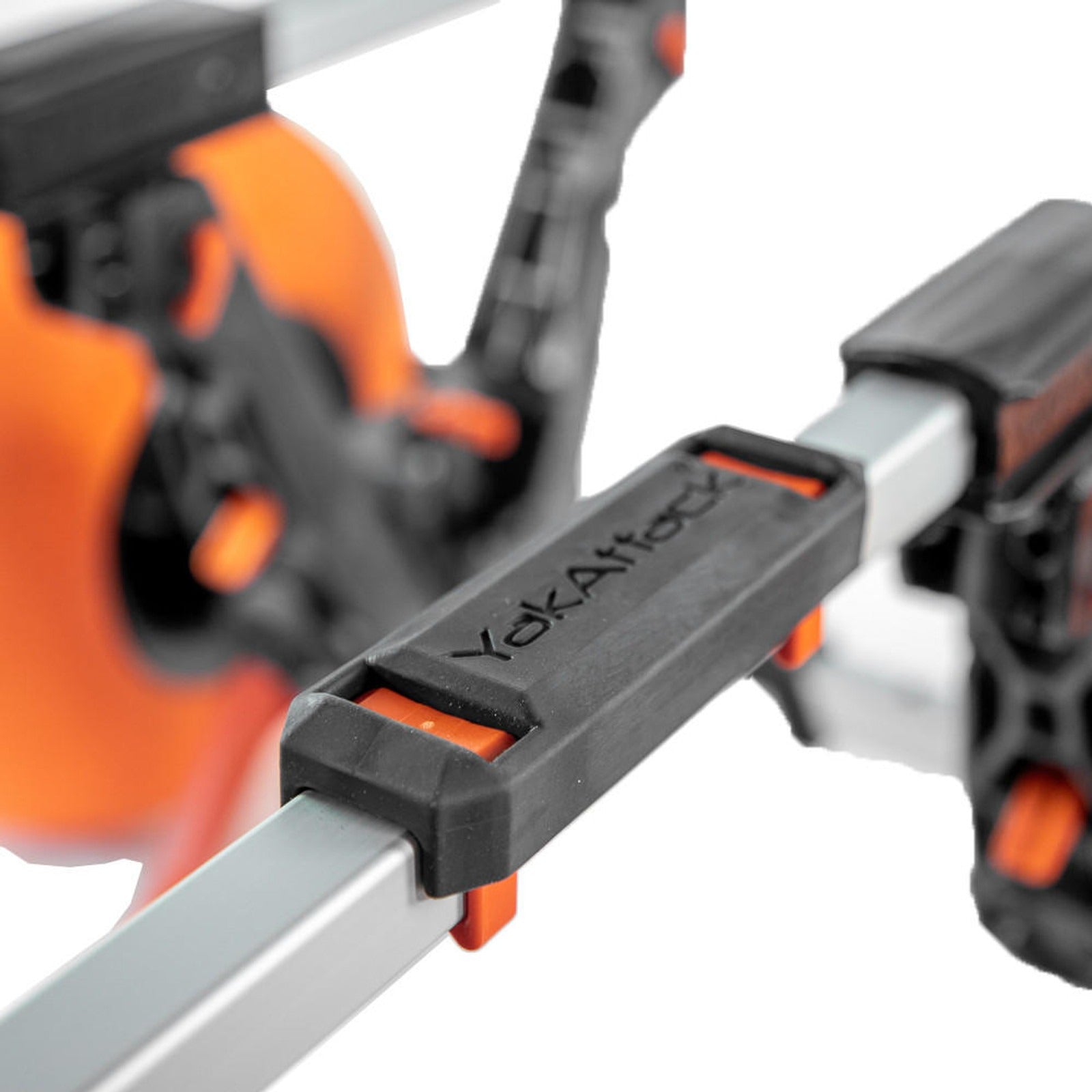 Bunks and Tie Downs: With the vast and ever-evolving shapes of modern-day kayak hulls, we knew our bunk system would require extreme versatility. When we found that inline bars worked better on some boats while crossbars worked better on others, we decided to build both options into the BarCart. You can transport “roof rack style,” putting the bars in a crossbar configuration for boats with pontoon-shaped or reasonably flat bottoms, or you can configure them in a traditional “bunk-style” configuration, where the bars are parallel to the hull of your vessel, for kayaks with more of a “V” shaped hull. In this configuration, the bars can be locked into 6 different positions, depending on your boat’s width and the shape of its hull. For securing a kayak to the BarCart there is a centralized tie-down point located at the center of the axle. The tie-down point is designed for 1” flat webbing cam straps (not included), but you can also use rope with less than 5/16” diameter. One distinct difference you will find from the original BeadLoc, hard surface tires is the Sand Tires do not feature the integrated tie down point on the end on the wheel hub. For added grip on the underside of your kayak, the BarCart includes four super “grippy” and easily positionable rubber bumpers. For long-term durability we opted for designing snap-on rubber bumpers instead of standard foam.
