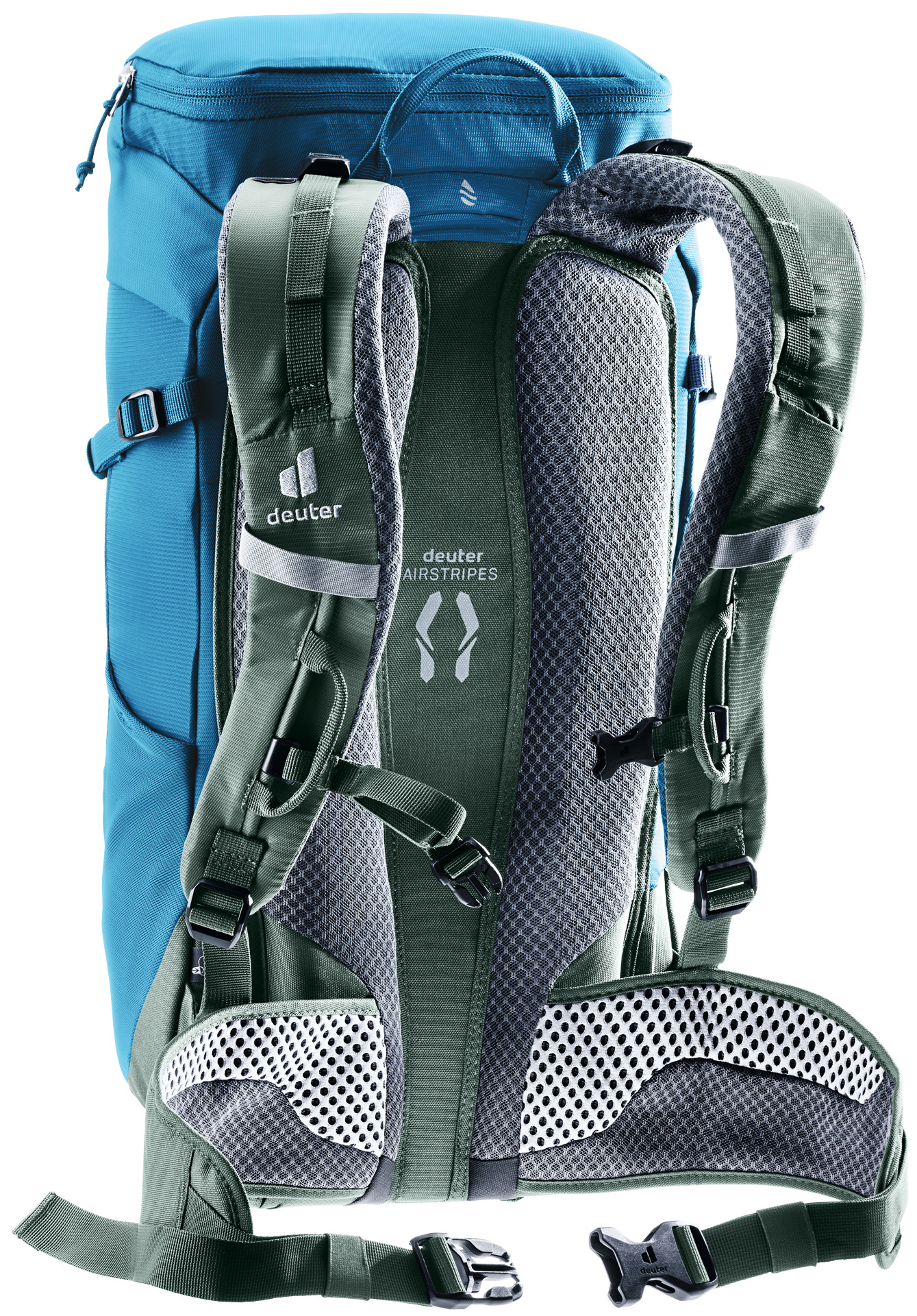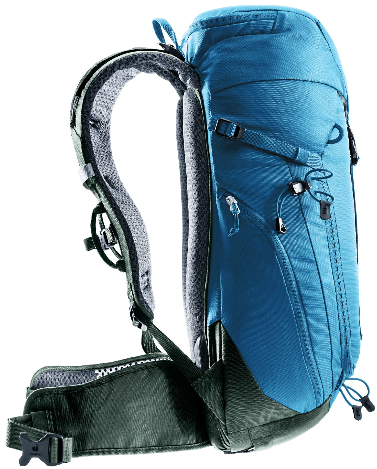 The reduced contact surface and large ventilation channels of the deuter Airstripes back system combined with perforated shoulder straps and hip fins ensure maximum airflow and even weight distribution – for a snug, secure fit over any terrain. The flat-format lid allows space for the head to move, even with a helmet on. Loops on the shoulder straps keep via ferrata set carabiners close at hand. And thanks to a large front zipper opening and side pockets, equipment and gear are always easy to access.