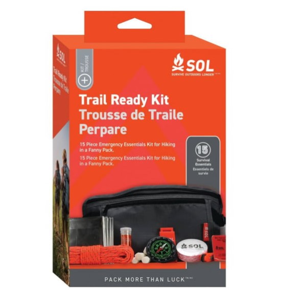 Gear up for your next hiking adventure with the SOL Trail Ready Kit. Packed with 15 survival essentials, you can hit the trail with confidence. A padded fanny pack with an adjustable waistband and 2 zipped pockets store all your gear. Wrap the reflective blanket around you to reflect your body’s thermal heat to keep you warm. Start a fire with the Tinder Quik and Micro Sparker or use the Tinder Cord to light your stove. Alternatively, use the Tinder Cord and reflective blanket to string up a shelter. Dry and clean off with the SOL TightPak Towel. Signal for help with the Slim Rescue Whistle and Reflective Mirror. Fix gear and gather food with the fishing-sewing kit and survival tool. Patch any holes with the mini duct tape roll. Navigate to safety with the liquid-filled compass. Safely explore new trails and old favorites with the SOL Trail Ready Kit.