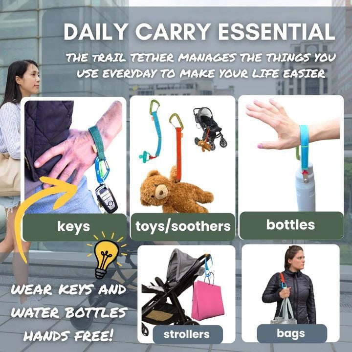 Trail Tether is a rugged, multi-use strap-and-carabiner system designed for everything from securing pacifiers to child carriers, to hanging gear while camping, to hands-free carrying of water bottles and keys with convenient wrist-wear functionality. Built for hiking, travel, and everyday utility, it quickly becomes the “extra hand” customers didn’t know they needed. Its versatility makes it a perfect adjacency to fast-moving products like water bottles, key accessories, and baby gear.
