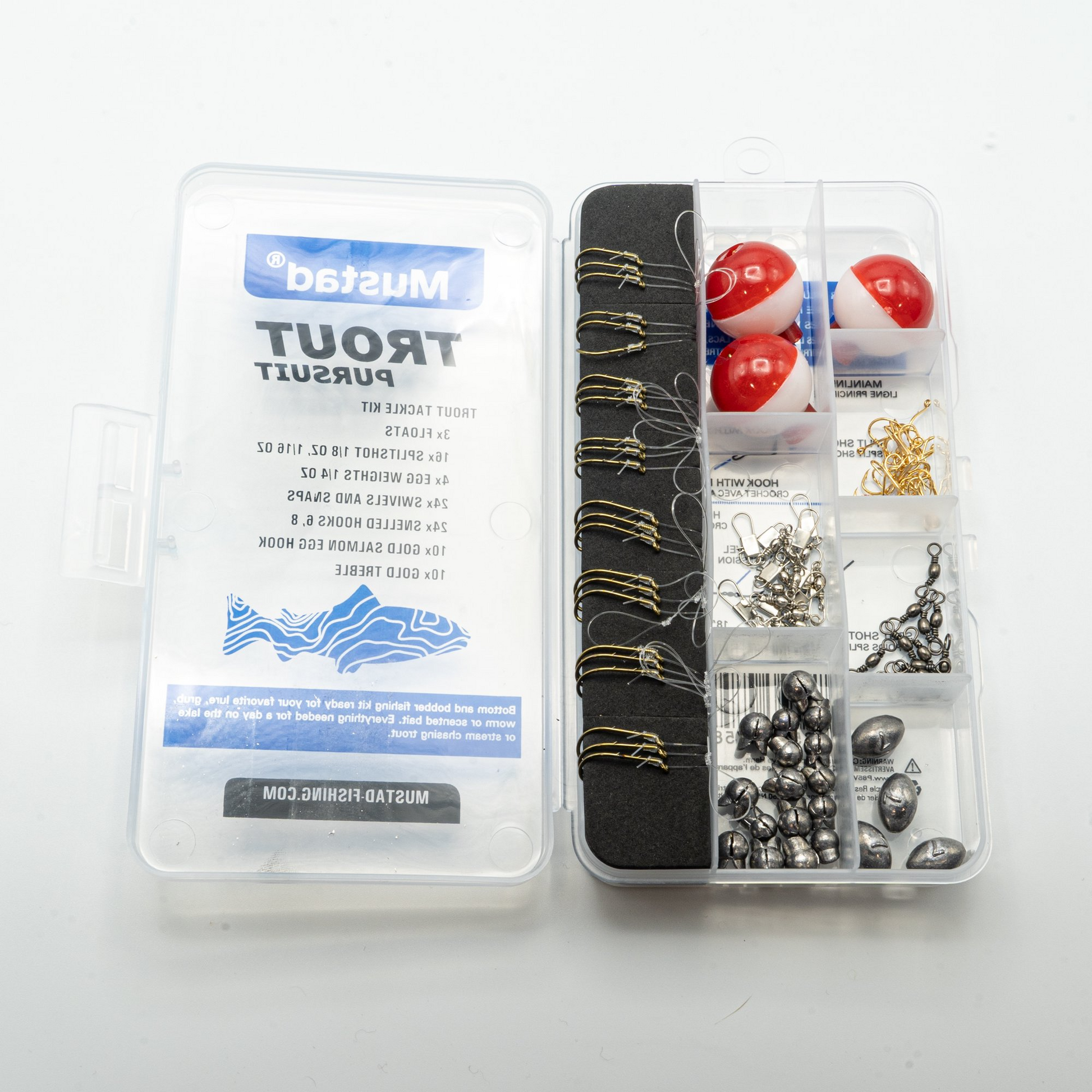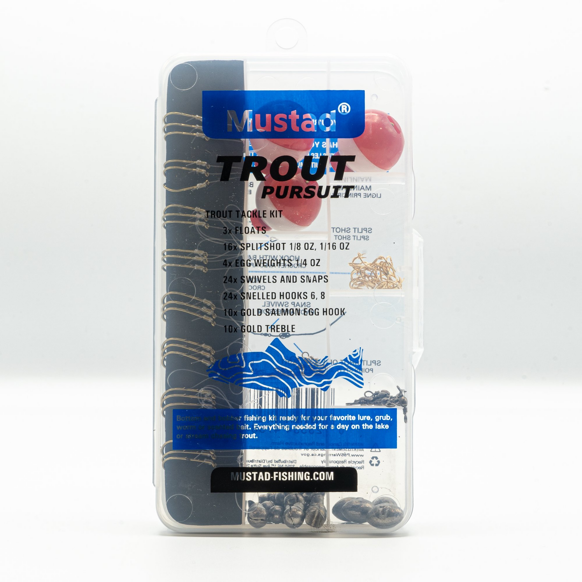The Mustad trout pursuit assorted Hook kit will get you and keep you on the water for your next outing. With a wide selection of top-performing hook models and sizes, this kit is ready for bait, power bait, and eggs. No need to grab weights either as this kit also includes a split shot and enough swivels to keep you hooked in the zone.