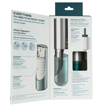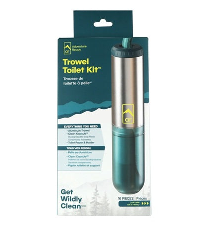 - Components: 1 Rugged forged aluminum camp trowel, 1 Adventure Ready Clean Capsule, 10g Biodegradable Soap Flakes, 10 Compressed Towelettes, 2 rolls Trail Toilet Paper, 1 roll Trail Packout Bags