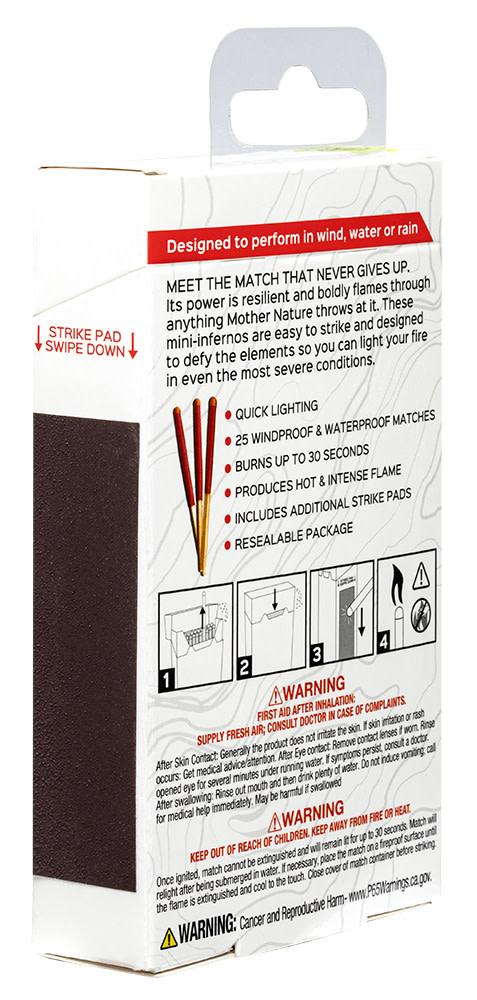 Its power is resilient and boldly flames through anything Mother Nature throws at it. These mini-infernos are easy to strike and designed to defy elements so you can light your fire in even the most severe conditions. Comes packaged in a blister pack.