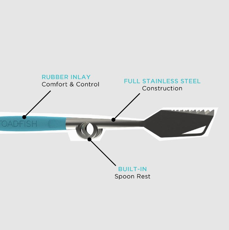At Toadfish, we love to grill. So, we set out to design the best tools on the market for backyard chefs as passionate as we are. To innovate a pair of tongs was a tall order but we created something far more versatile than traditional designs. The Toadfish Ultimate Grill Tong has a tapered, sharpened flat front to act as a spatula when you need it. The pronged top edge will grab and flip anything. This fine-tuned, all stainless steel masterpiece sits balanced, weighted, and securely in the hand with soft-touch rubber inlays. The built-in spoon rest keeps your surfaces clean and your food sanitary. So light the coals, sit back, and enjoy a cold beverage knowing you’ve got the right tool for the job.