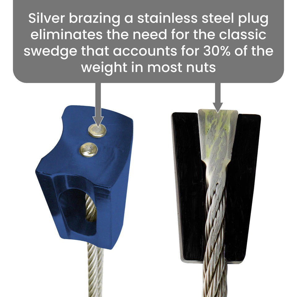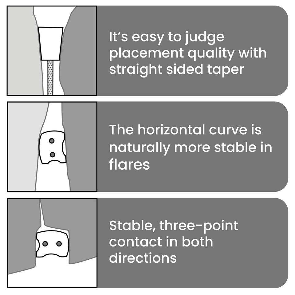 Side-to side curvature and an asymmetric taper make Ultralight Asymmetric Curve Nuts more stable in flaring placements and give solid, 3-point contact in both placement directions, while the straight-sided, top-to-bottom taper makes it easy to judge placement quality.